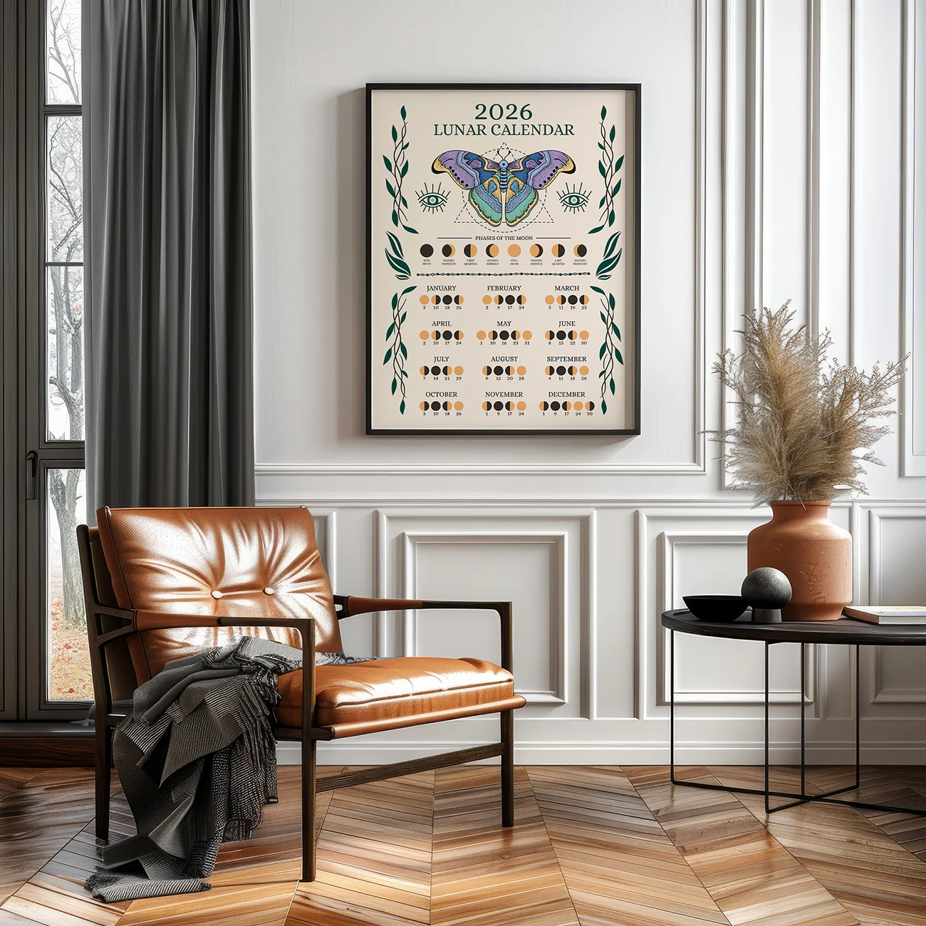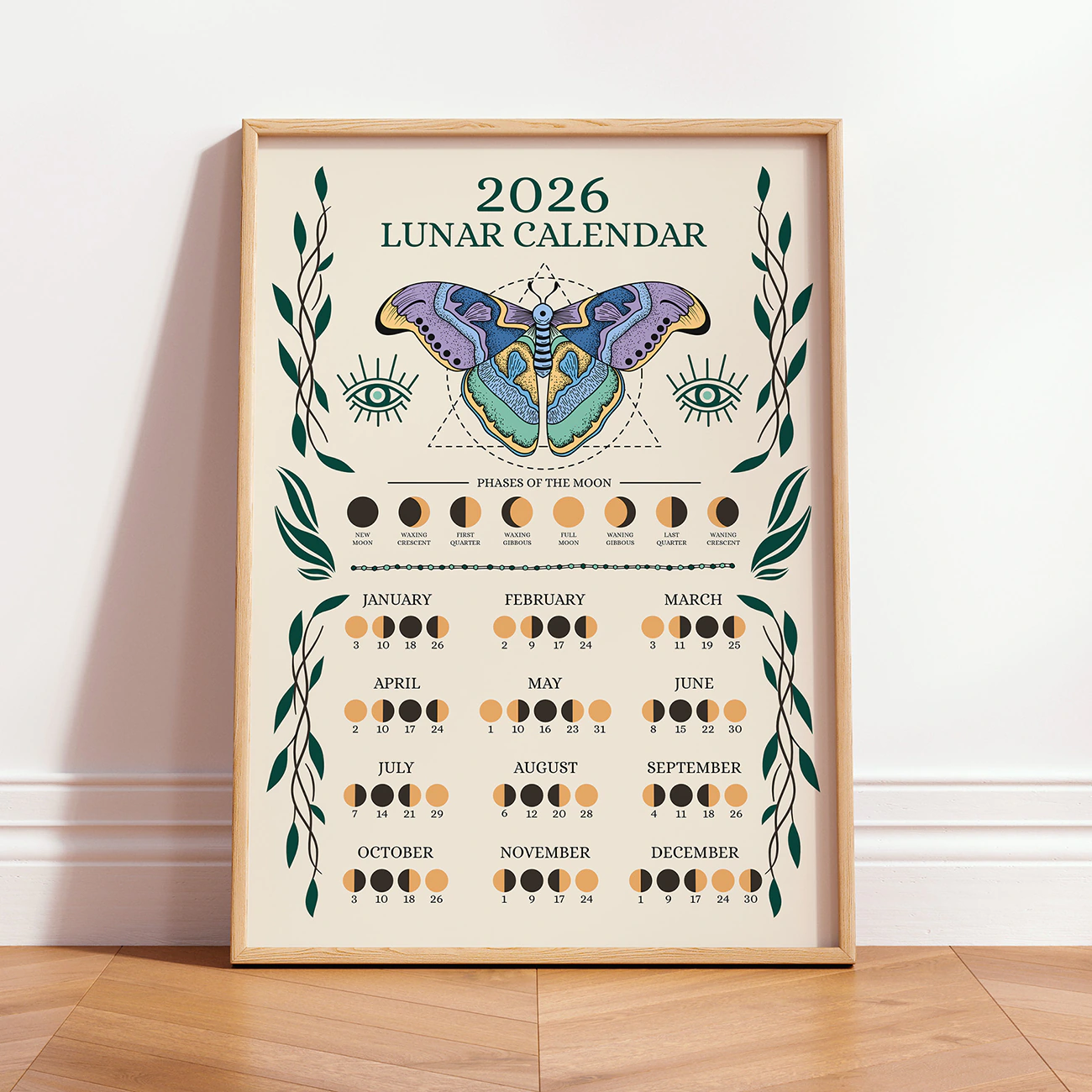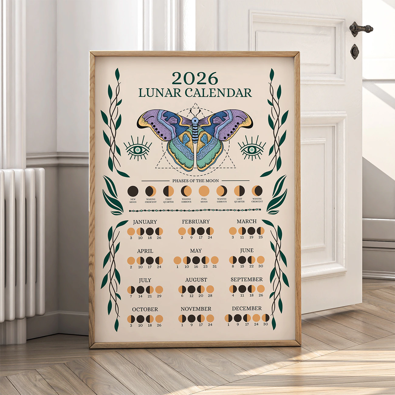 This striking gold butterfly is surrounded by celestial symbols and a full year of moon phases on a dramatic black background. Because of its modern design, the 2026 lunar calendar brings a mystical accent to bedrooms, meditation spaces, or creative studios. If you love astrology or want to follow the moon’s cycles, this wall art will inspire you all year. For more celestial decor, explore our Astrology Wall Art collection.