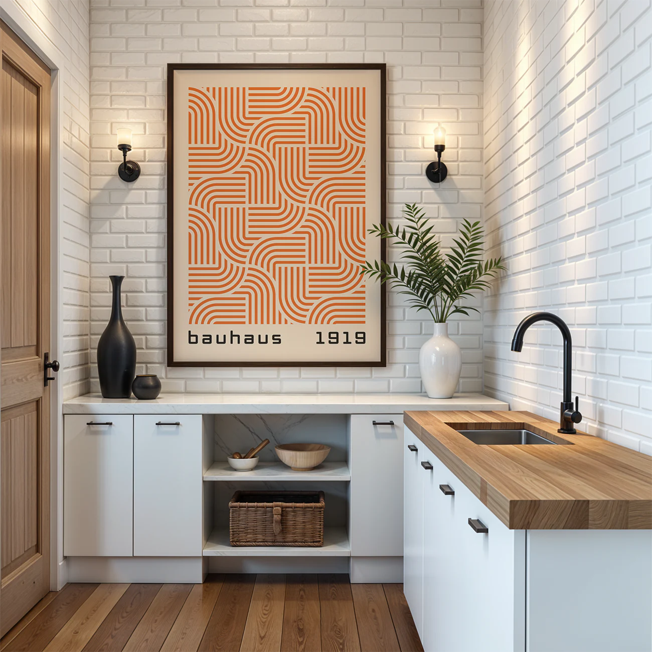 Abstract minimalist wall art lights up any room with its simple, flowing design. In “Retro Lines,” bright orange stripes curve and connect on soft cream paper, creating a happy dance of shape and space. Expertly made by a Bauhaus poster designer, this piece adds fun and style without crowding your walls. Hang it above your couch, in a hallway, or by your desk to bring warmth and energy. The clean lines and open areas keep your space feeling fresh and neat. Enjoy how each curve sparks joy and creativity—truly the beauty of abstract minimalist wall art.