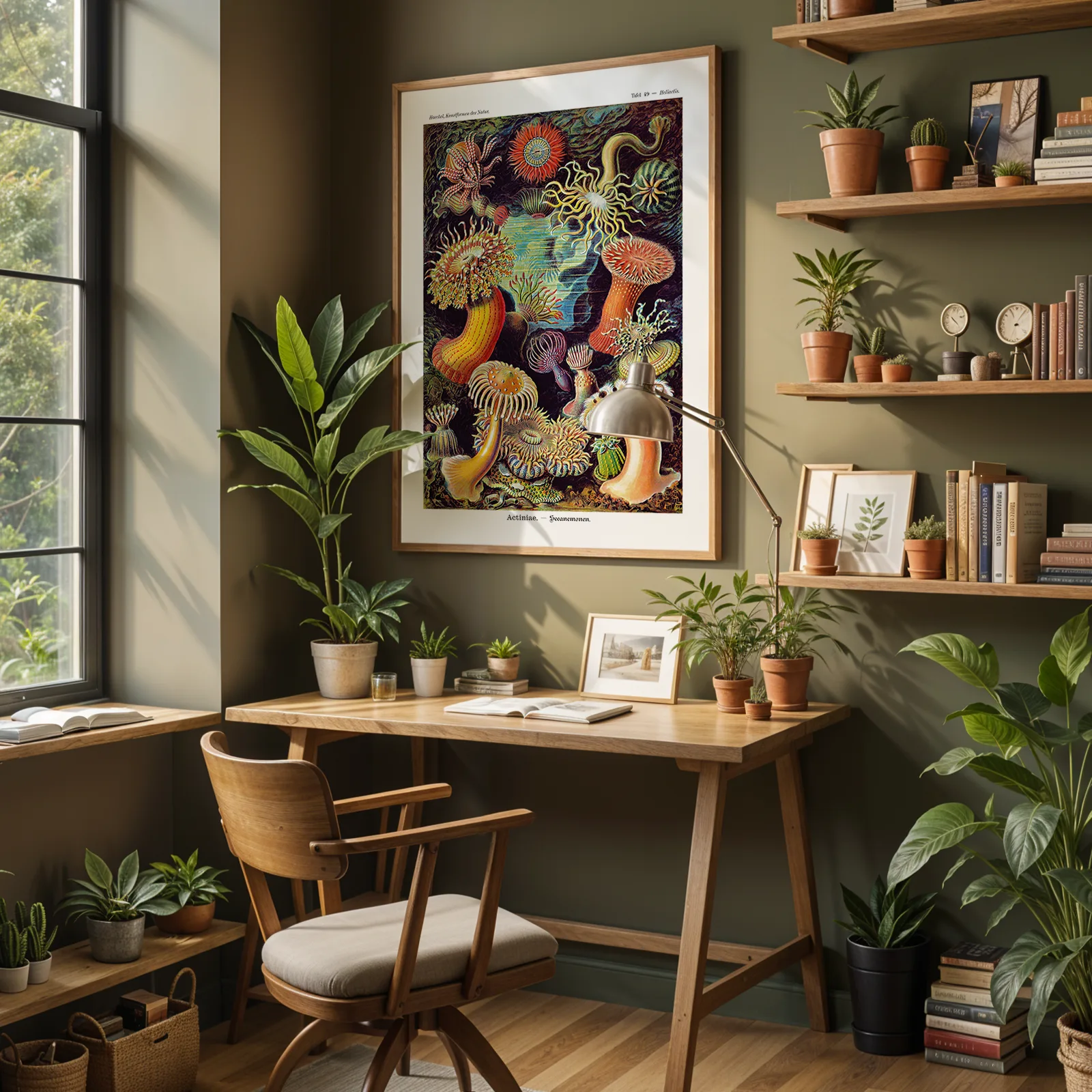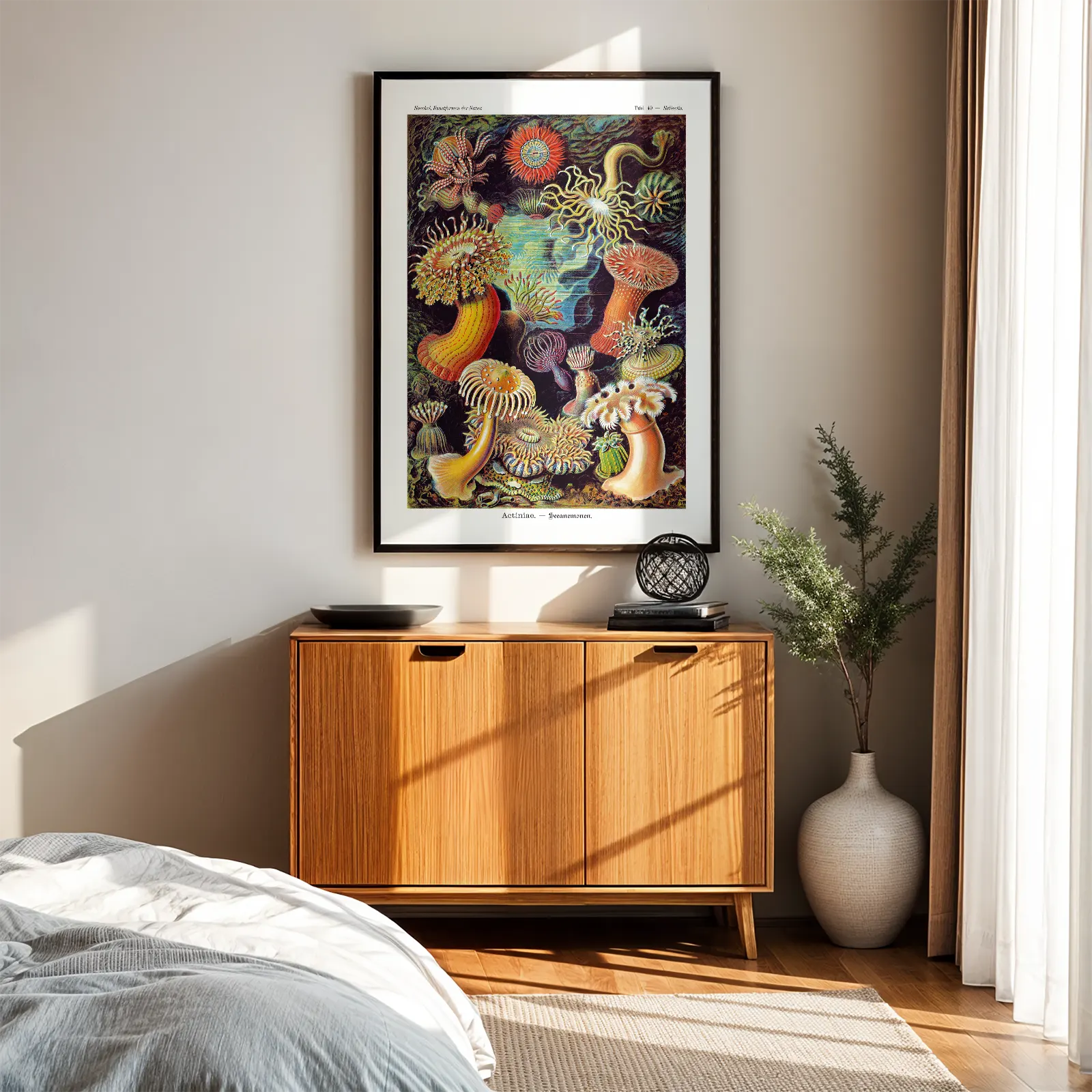 This Ernst Haeckel poster brings the strange beauty of sea anemones to life in vivid color and organic detail. Taken from Haeckel’s Art Forms of Nature, the illustration blends scientific study with bold, imaginative design, making it perfect for creative homes, modern workspaces, or classrooms. The flowing forms and bright tones offer a sense of motion and wonder, ideal for sparking curiosity and conversation. Printed on premium paper, this Ernst Haeckel poster transforms a scientific plate into striking wall art for nature and design lovers alike.