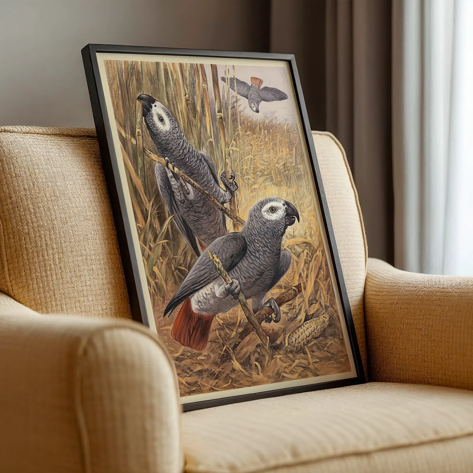 This beautiful parrot poster shows the elegance and intelligence of African grey parrots in a rich natural setting. The early 20th century German artwork reproduction captures fine feather details, warm earthy tones, and a calm background of tall grasses that create depth and character. It fits perfectly in a living room, office, or creative space where you want a touch of nature and vintage charm. Printed on high quality paper, this parrot poster brings timeless style and personality into your home.