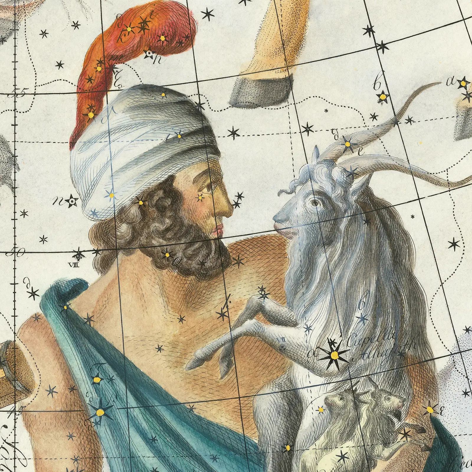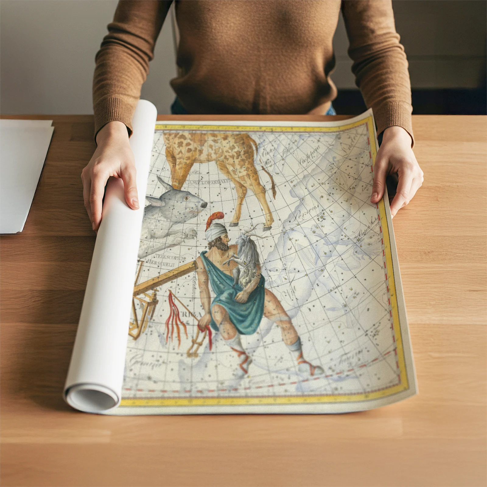 This beautifully illustrated antique celestial map blends astronomy and classical mythology in a rich and detailed star chart. The early 19th century German artwork reproduction, created by a respected astronomer and mathematician, presents constellations woven together with symbolic figures and precise celestial markings. Fine lines, soft aged tones, and decorative borders give the piece both scientific depth and artistic elegance. Perfect for a study, office, or living room, this antique celestial map is printed on high quality paper and adds historic charm and intellectual character to your space.