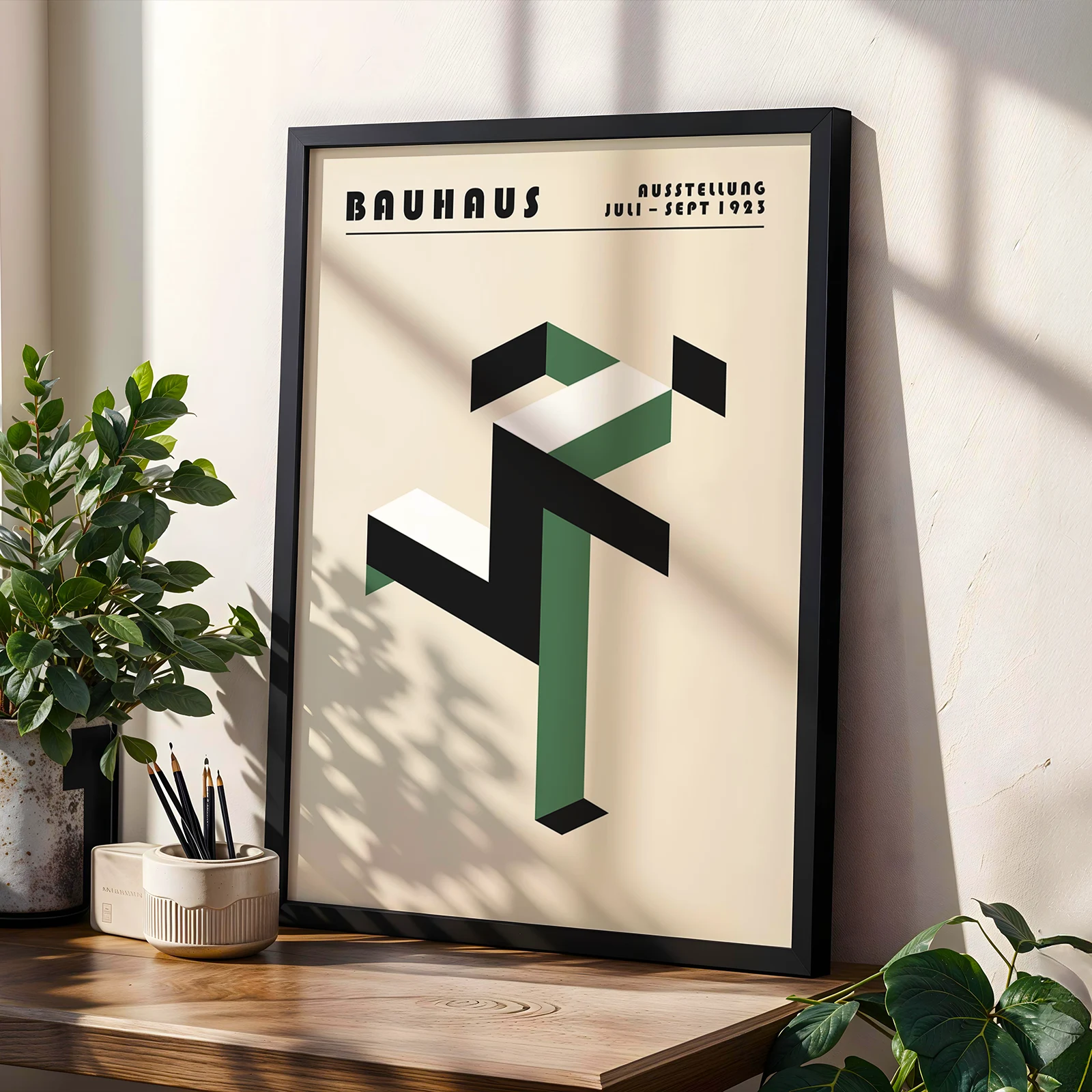 Art print Bauhaus turns your wall into a playground of pure geometric genius—clean black and green shapes dancing together to create the iconic “Running Man” figure in motion. Every angle and line follows that classic Bauhaus rule where function meets form, turning simple rectangles and parallelograms into something that feels alive and dynamic. The crisp composition against that warm beige paper captures the movement’s love for clarity without losing any energy or punch. This piece shows how smart design can tell a whole story using just basic shapes and clever placement, making any room feel more engaging and modern. Hang this art print Bauhaus and let its playful geometry bring that timeless revolutionary spirit into your space every single day.