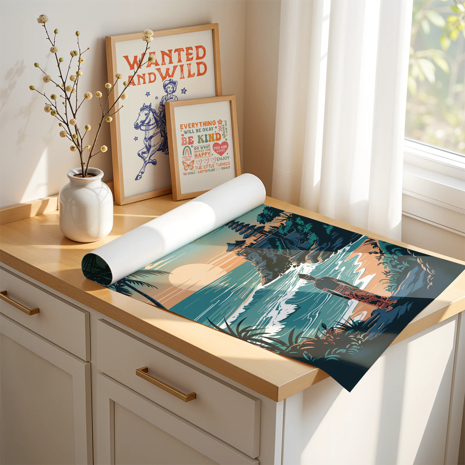 You can order our prints either framed or unframed. Our frames are crafted from lightweight pine wood, measuring 2 cm in width. Each frame includes an acrylic front protector and hanging hardware for easy setup.