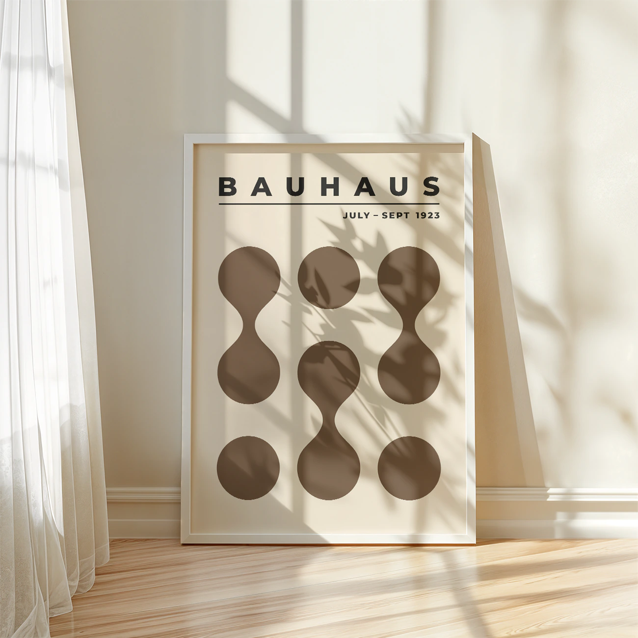 Bauhaus 1923 poster greets you with nine warm brown shapes—three solid circles at the top, three at the bottom, and three hourglass forms in the center—set against soft cream paper for a look that’s clean and inviting. “Circle Drops” blends playful curves with precise alignment, showing how simple geometry can brighten any room. As Mid Century wall art, it fits perfectly above a sofa, in a study nook, or along a hallway, adding a dash of color and design history without overwhelming your space. Let this Bauhaus 1923 poster turn your walls into a lively showcase of shape and style!