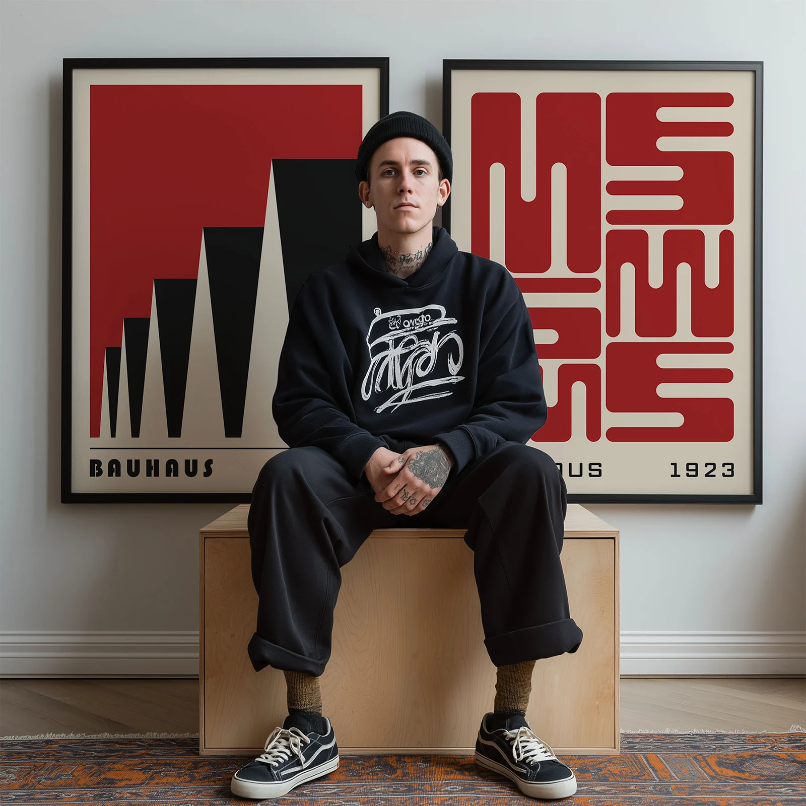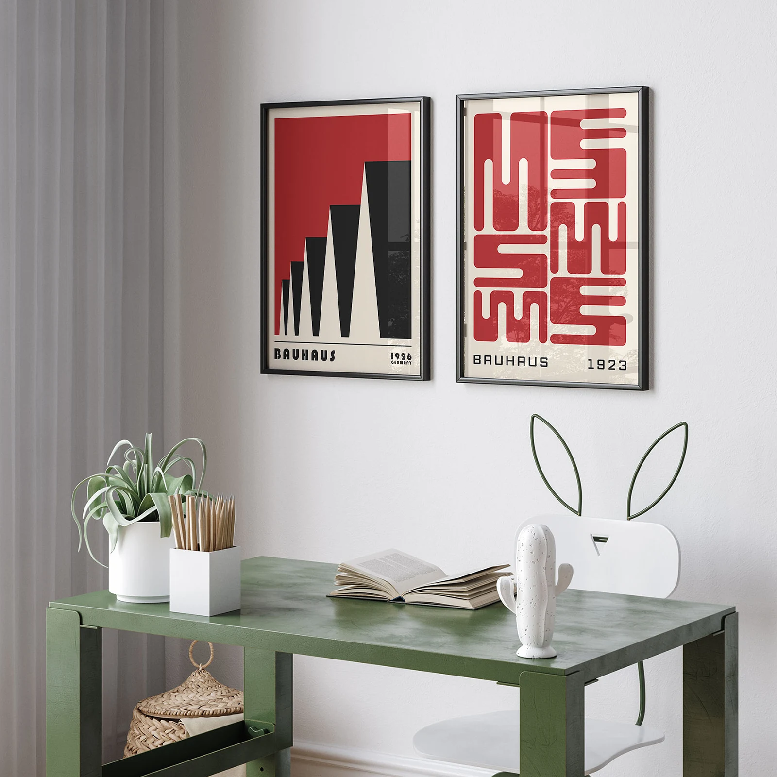 This 2 piece wall art set shows two different Bauhaus-style posters in bold red and black colors. One poster has shapes that look like factory rooftops in a growing pattern, and the other shows soft, blocky forms in a neat layout. These prints are great for modern homes, offices, or creative spaces, bringing a clean and strong look to your wall. Both are printed on high-quality paper, so the colors stay rich. This 2 piece wall art set is a great way to add bold, modern style to your room.