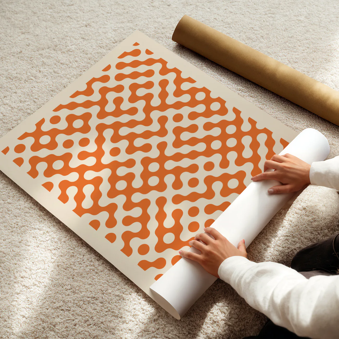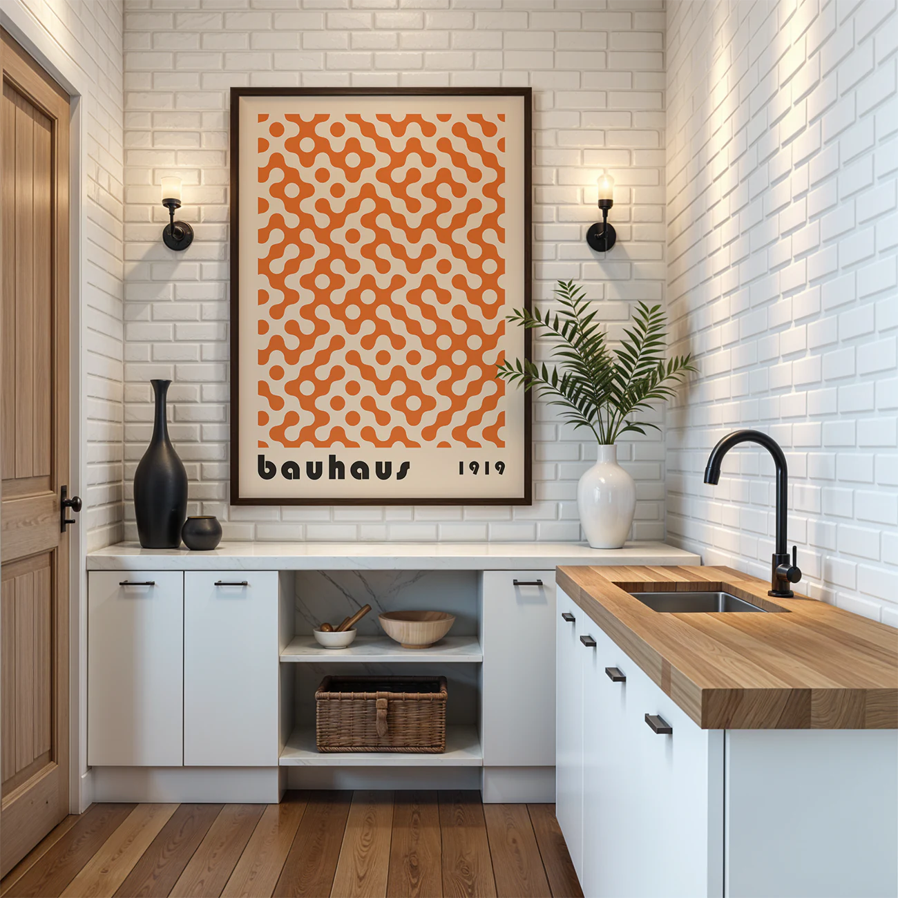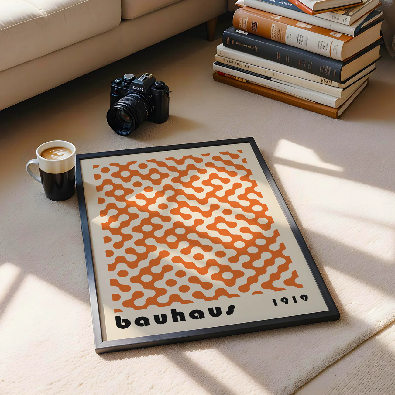 Bauhaus art poster greets your room with a lively cascade of orange dots and flowing lines printed on smooth cream paper, instantly turning any wall into a statement of playful elegance. As a devoted Bauhaus expert, you’ll admire how each rounded form and connecting arc embodies the school’s belief that form follows function, creating a harmonious rhythm that feels both purposeful and joyful. This minimalist wall art piece fits effortlessly above a sleek sofa, brightens a home office, or anchors a modern hallway with warm energy. Dive into its dynamic geometry and let “Dot Flow” bring a burst of design heritage and spirited creativity to your space as the perfect Bauhaus art poster.