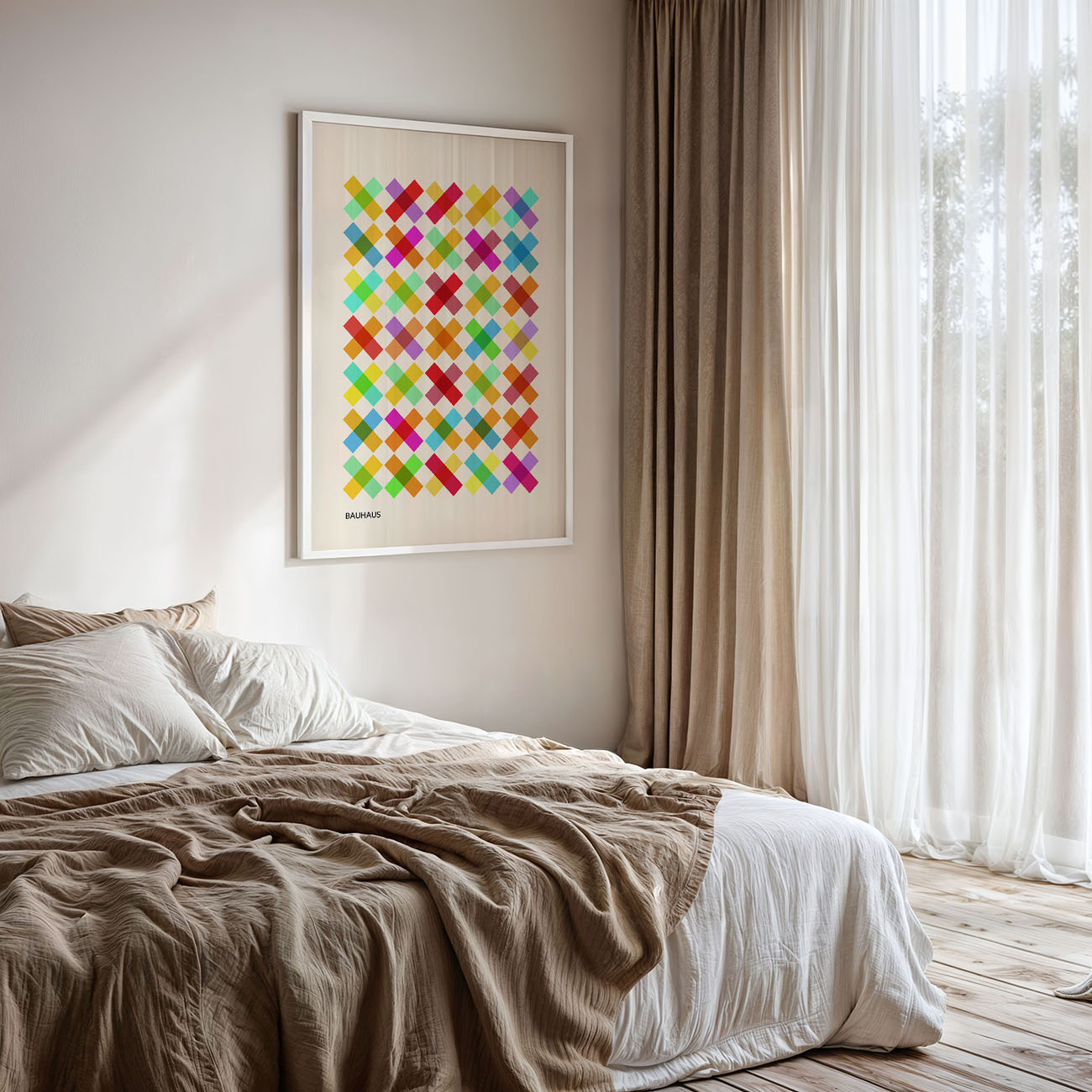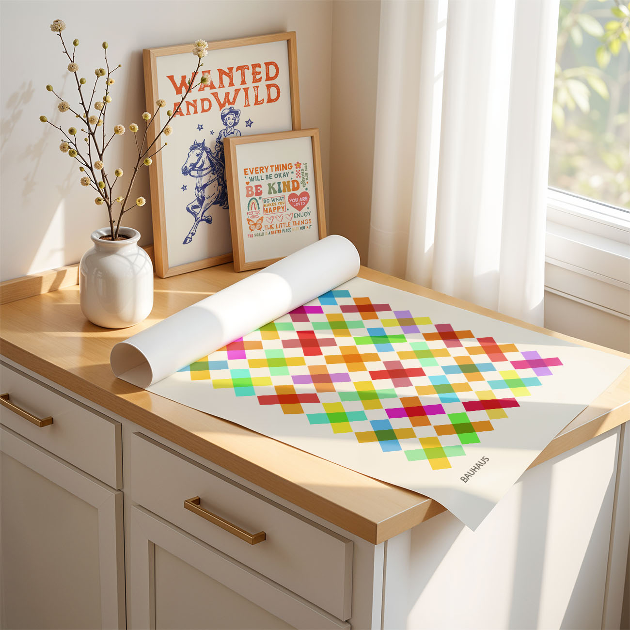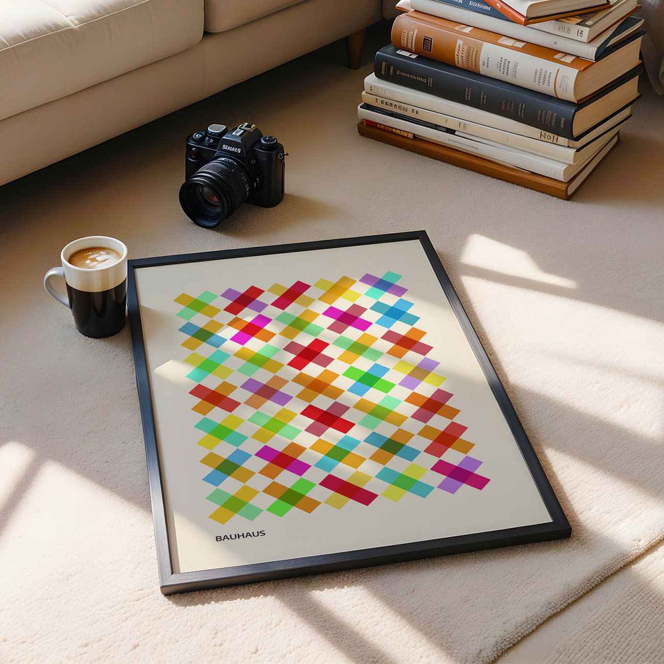 This Bauhaus art print is pure color therapy for your wall—rows of overlapping squares in every shade you can imagine, lining up in a way that feels both playful and perfectly precise. The crisp geometry and soft cream background give it that unmistakable Bauhaus vibe, but there’s a warmth here that keeps things friendly, not cold. It’s the kind of minimalist Bauhaus poster that quietly steals the show, whether you hang it in your living room, office, or creative space. Let this Bauhaus art print bring a pop of energy and a little design history into your everyday—simple, bold, and always in style.