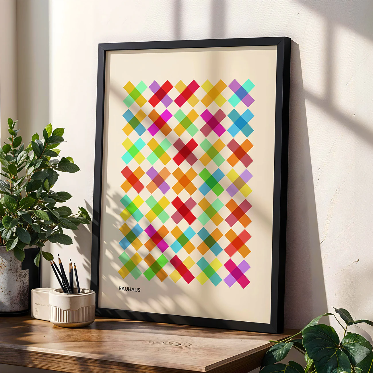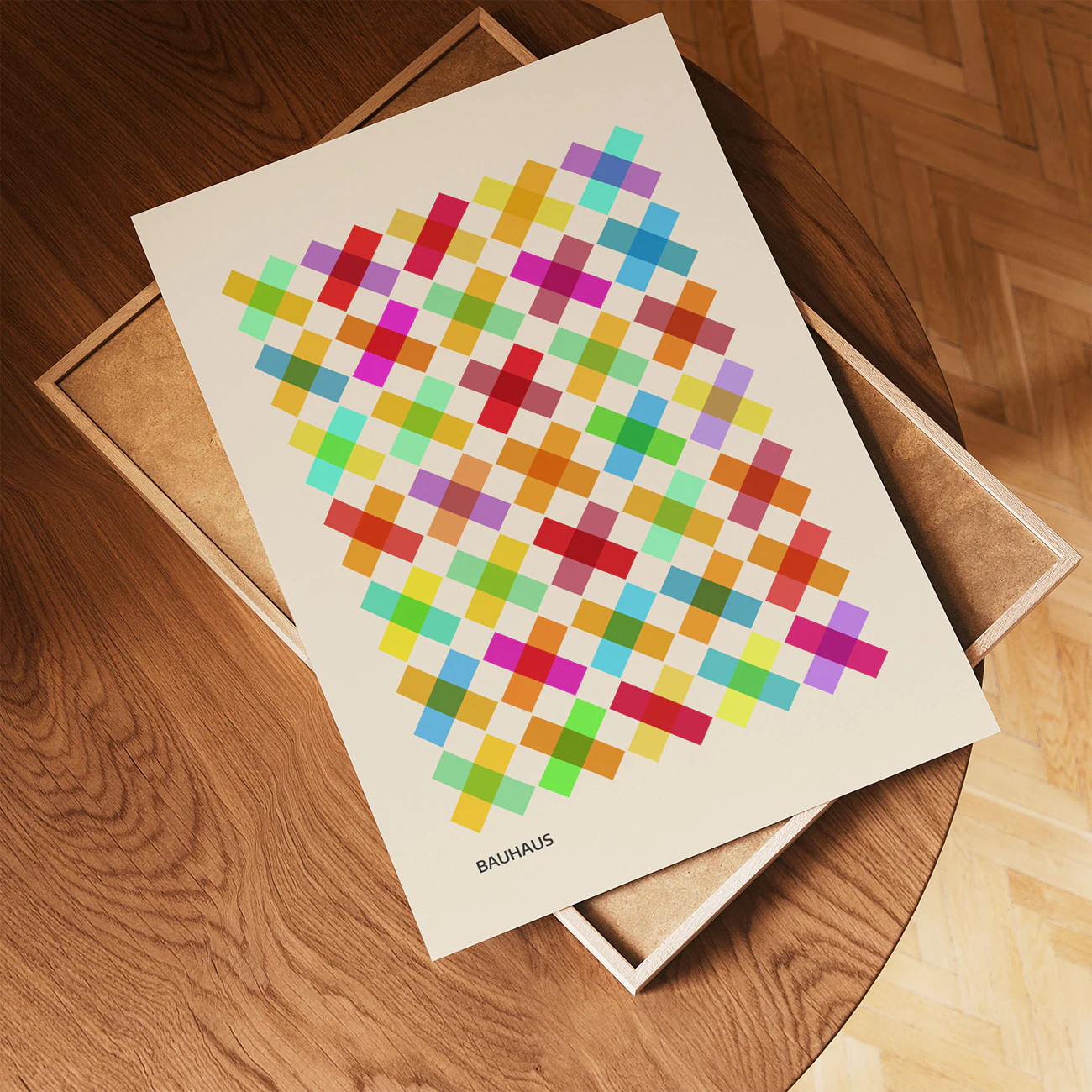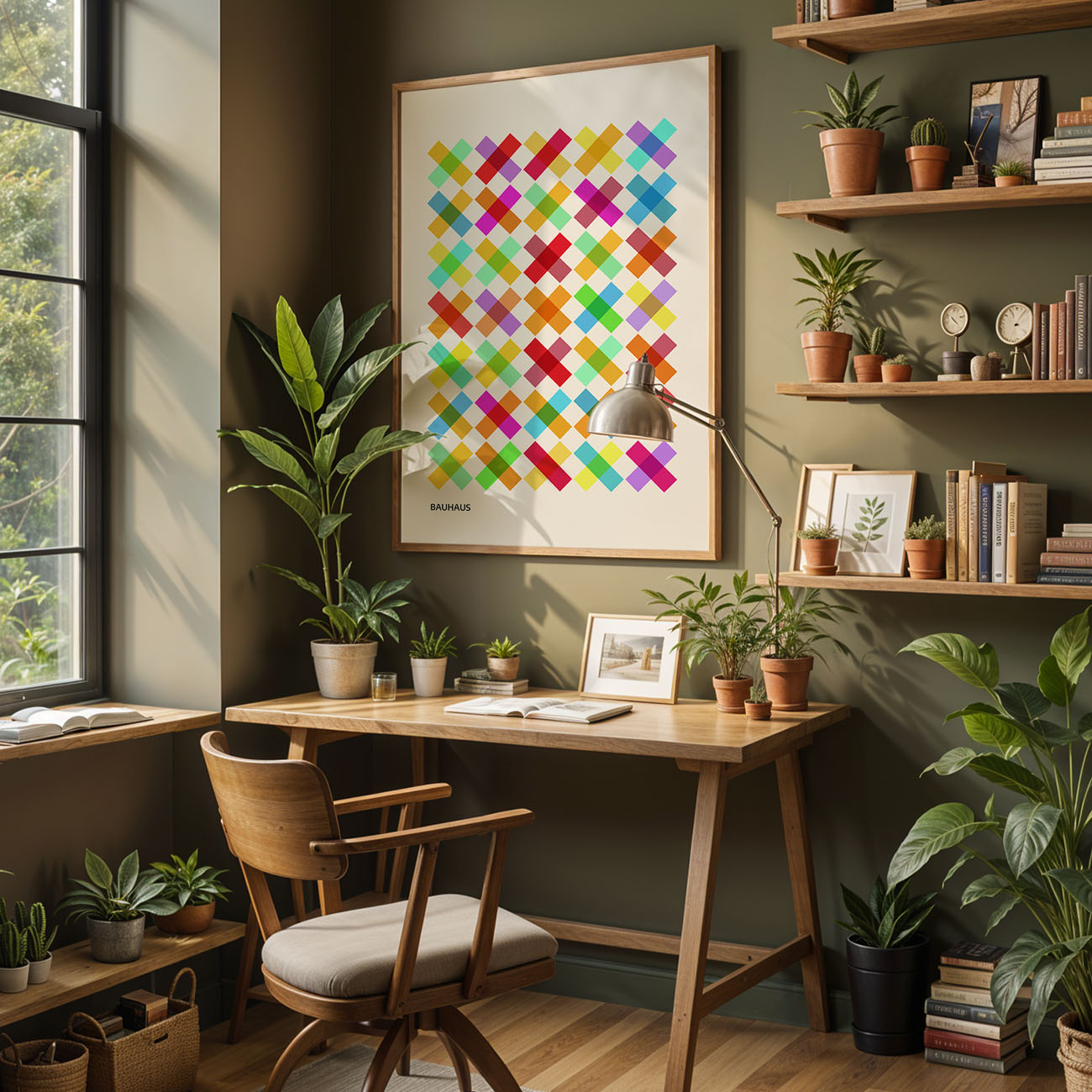 This Bauhaus art print is pure color therapy for your wall—rows of overlapping squares in every shade you can imagine, lining up in a way that feels both playful and perfectly precise. The crisp geometry and soft cream background give it that unmistakable Bauhaus vibe, but there’s a warmth here that keeps things friendly, not cold. It’s the kind of minimalist Bauhaus poster that quietly steals the show, whether you hang it in your living room, office, or creative space. Let this Bauhaus art print bring a pop of energy and a little design history into your everyday—simple, bold, and always in style.