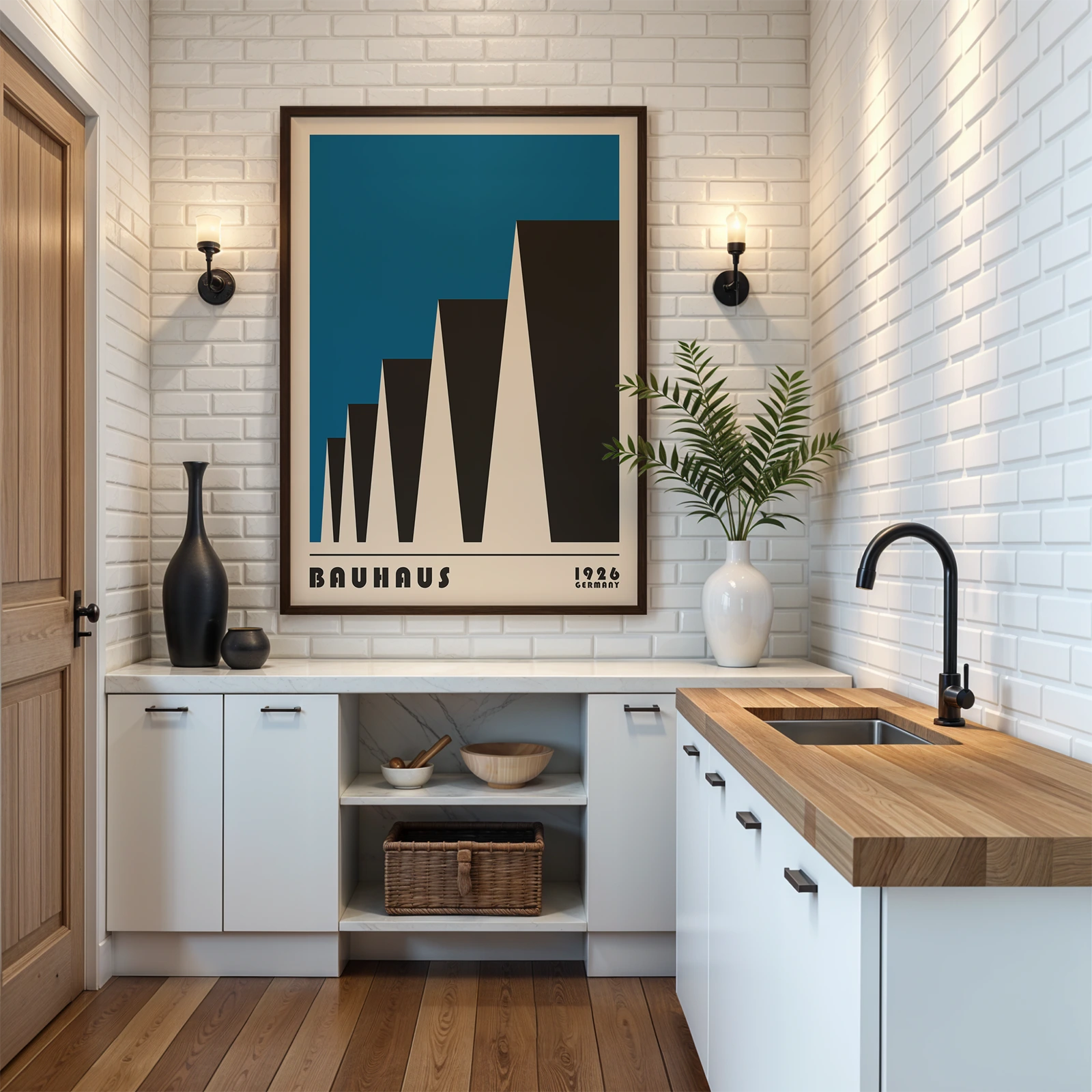 Step into the world of modern design history with this Bauhaus exhibition 1923 poster, where bold black triangles rise and fall against a blue sky, inspired by clean industrial architecture. “Factory Roofs” captures the spirit of the era with its strong shapes and simple lines—showing how minimalism can feel both energetic and welcoming. As minimalist wall art, this piece fits perfectly above a sofa, in a home office, or along a hallway, adding instant style without overwhelming your space. Let the vision of the Bauhaus exhibition 1923 bring a dash of creative flair and timeless inspiration to your everyday.