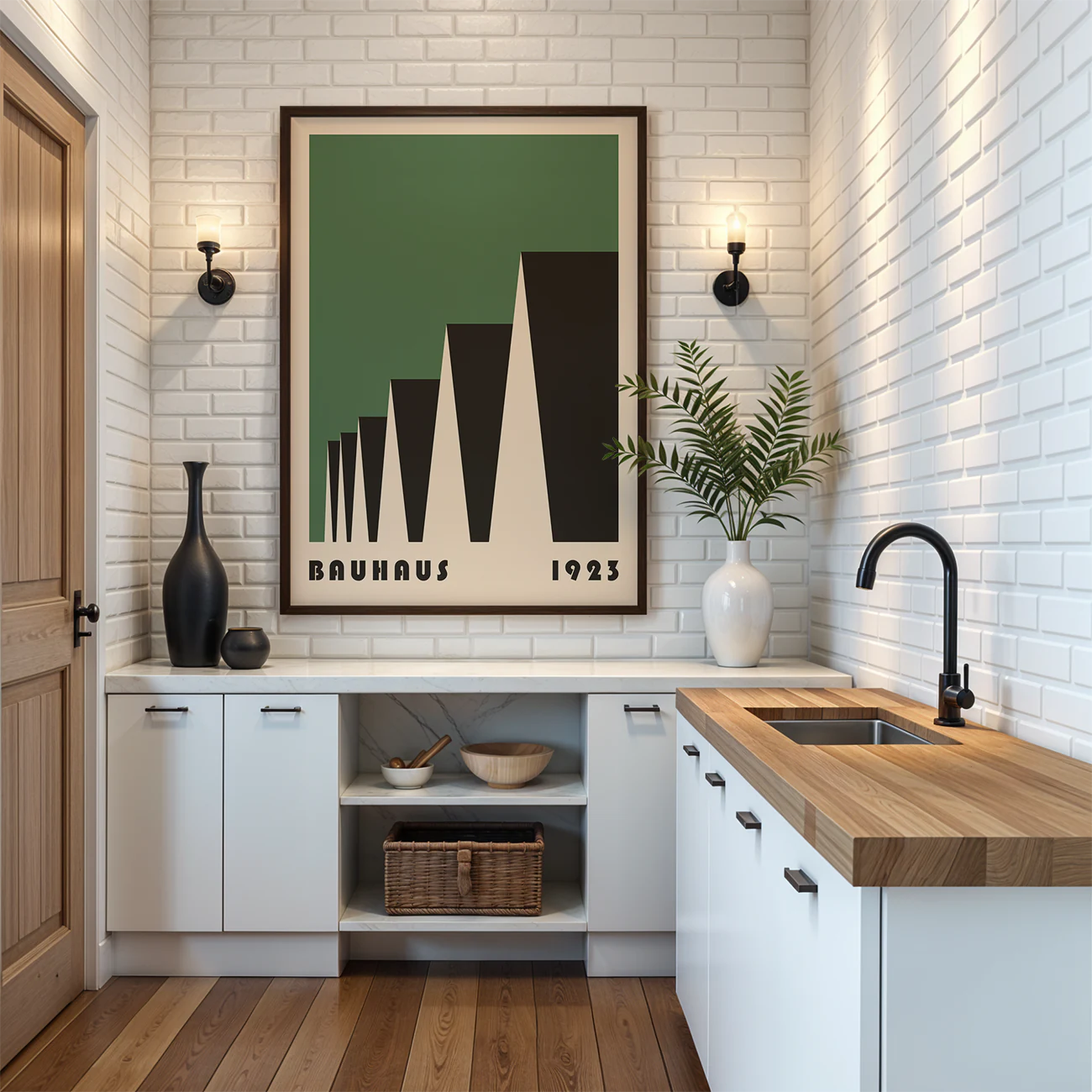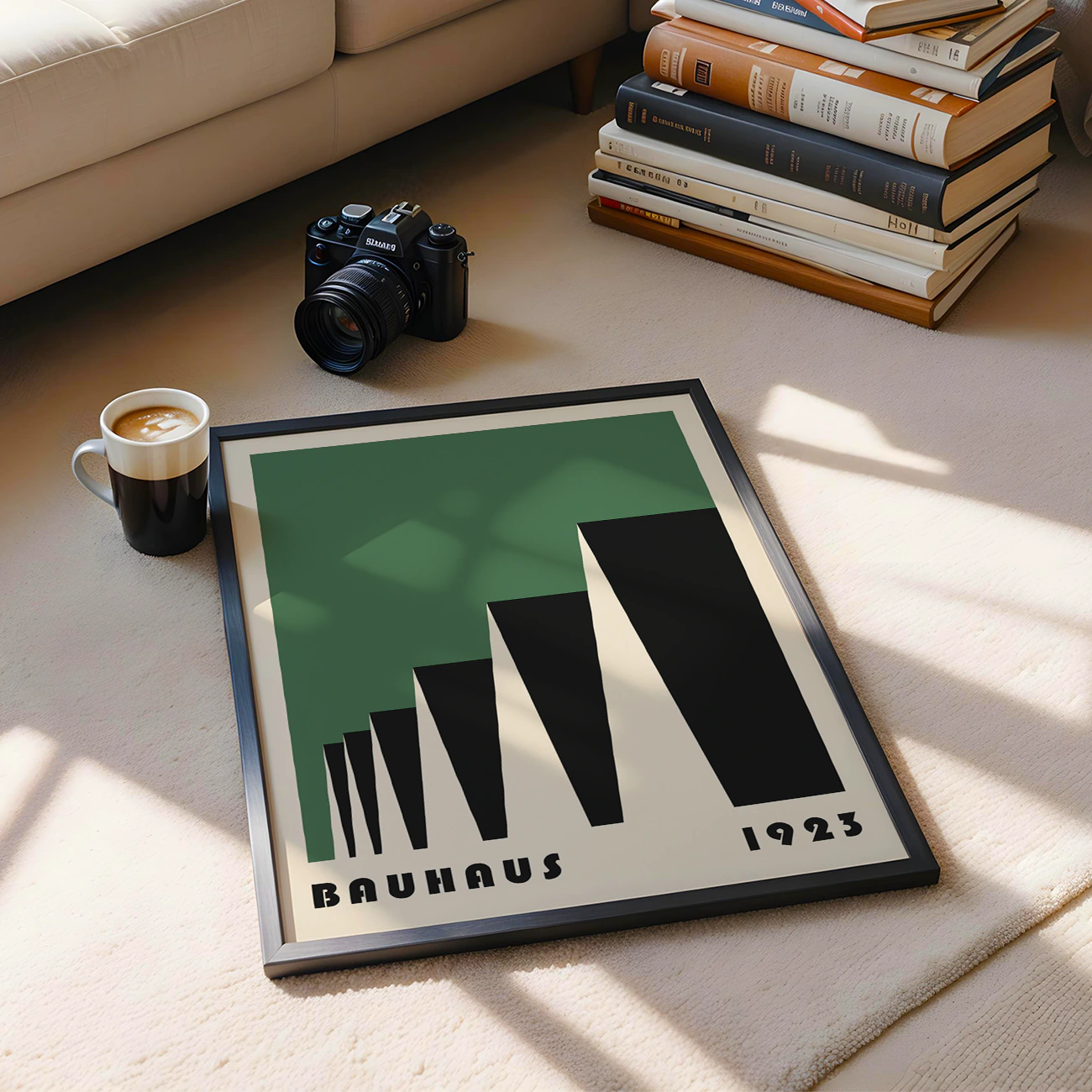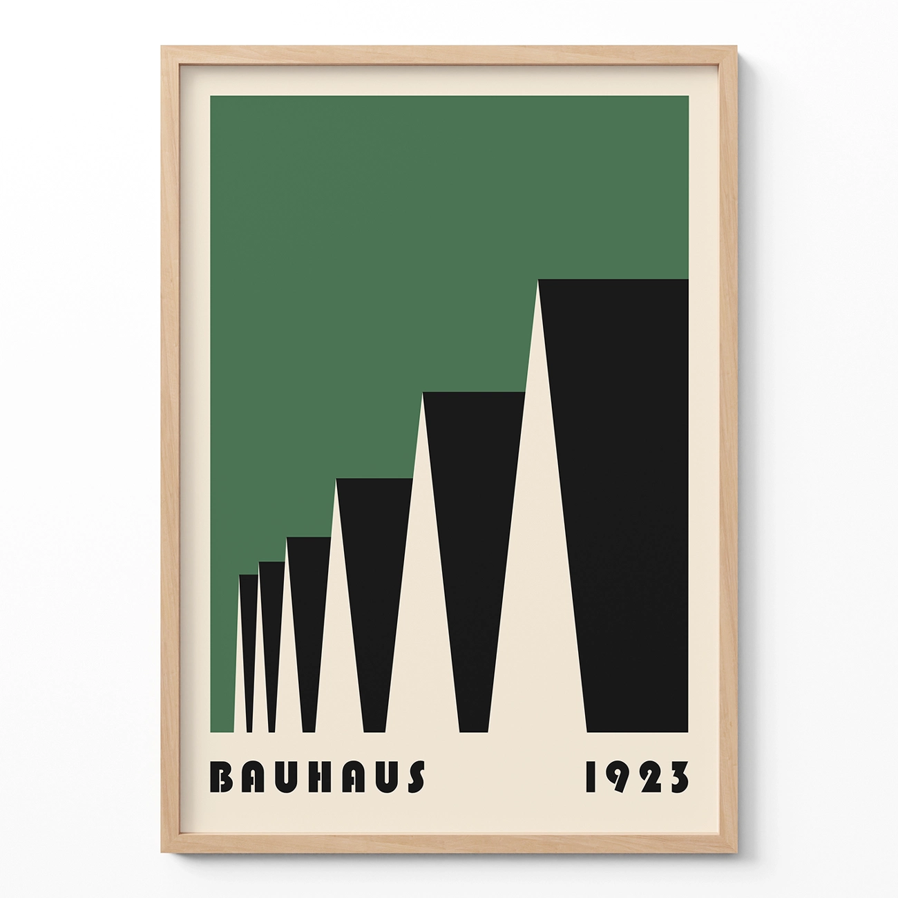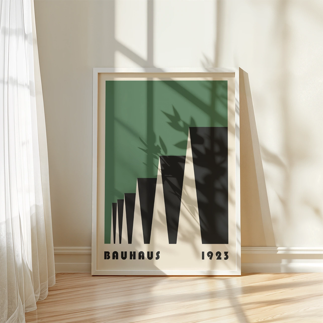 Bring a fresh pop of history to your home with this stunning piece from the Bauhaus exhibition 1923, where bold black shapes rise against a rich green sky like modern buildings reaching up high. “Factory Roofs” shows how clean lines and simple colors can make any room feel more alive and interesting. Perfect as a minimalist art print, it fits right in above your sofa, in your workspace, or down a hallway—adding style without taking over. Let the smart design ideas from the Bauhaus exhibition 1923 give your walls that special touch of timeless cool.