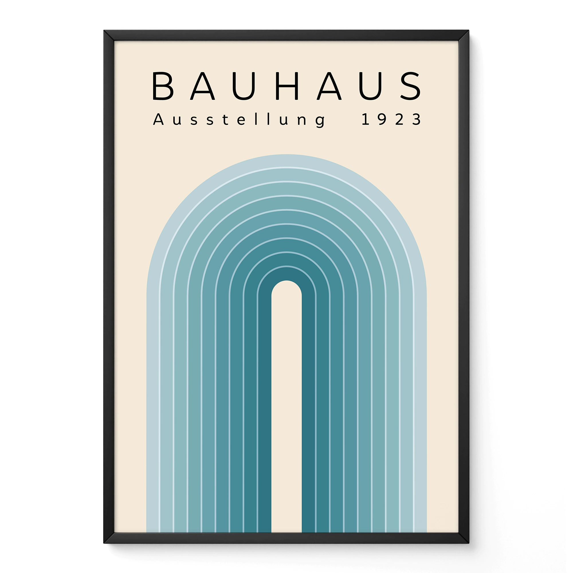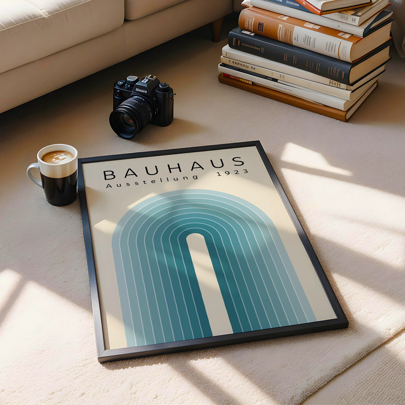 This Bauhaus exhibition poster is all about clean lines and cool confidence—just what you want from classic Bauhaus posters. The soft blue arches pull your eye right in, creating a sense of movement and calm at the same time. Up top, the crisp “BAUHAUS Ausstellung 1923” headline sets the mood: a nod to art history, but with a fresh, modern edge. Whether you hang this Bauhaus exhibition poster in your office, hallway, or creative space, it’s an instant upgrade—simple, striking, and quietly bold. It’s the kind of wall art that makes you want to clear the clutter and let good design do the talking.
