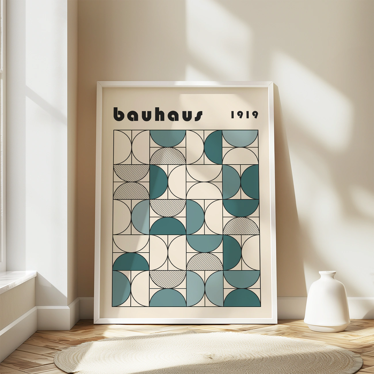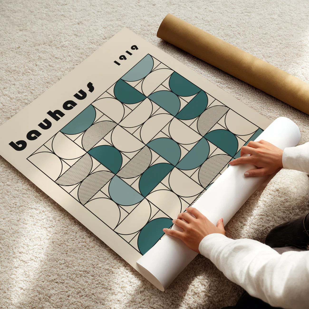 Bauhaus graphic invites you into a lively world of shapes and lines. This print shows a grid of semi-circles, quarter-circles, and clean diagonal stripes in soothing teal and cream. Each piece fits together like a puzzle, guiding your eye through a playful rhythm of curves and edges. The soft teal tones add calm, while the bold pattern brings fresh energy. Hang this piece above a sofa, in your study, or down a hallway—adding style without clutter. Its clear forms prove that simple geometry can make a big impact. Trust this Bauhaus graphic to transform your wall into inspiring geometric wall art every day.