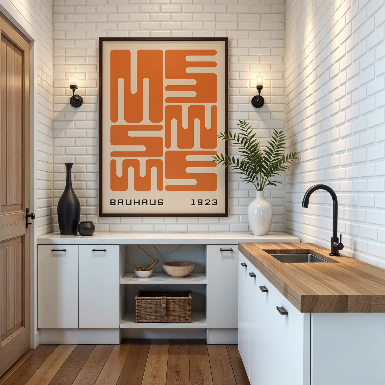 Bauhaus original poster greets you with smooth, flowing lines and bold blocks that draw the eye. Titled “Waves,” this piece plays with simple curves in rich orange on soft cream, creating a balanced, lively scene. Designed by experts, it shows how few shapes can bring big style and fun into your home. Hang it above your sofa, in a hallway, or beside your desk to add a touch of history without clutter. As geometric wall art, it fits any room and brightens your walls with clean, smart design. Let this Bauhaus original poster bring fresh energy and joy every day.