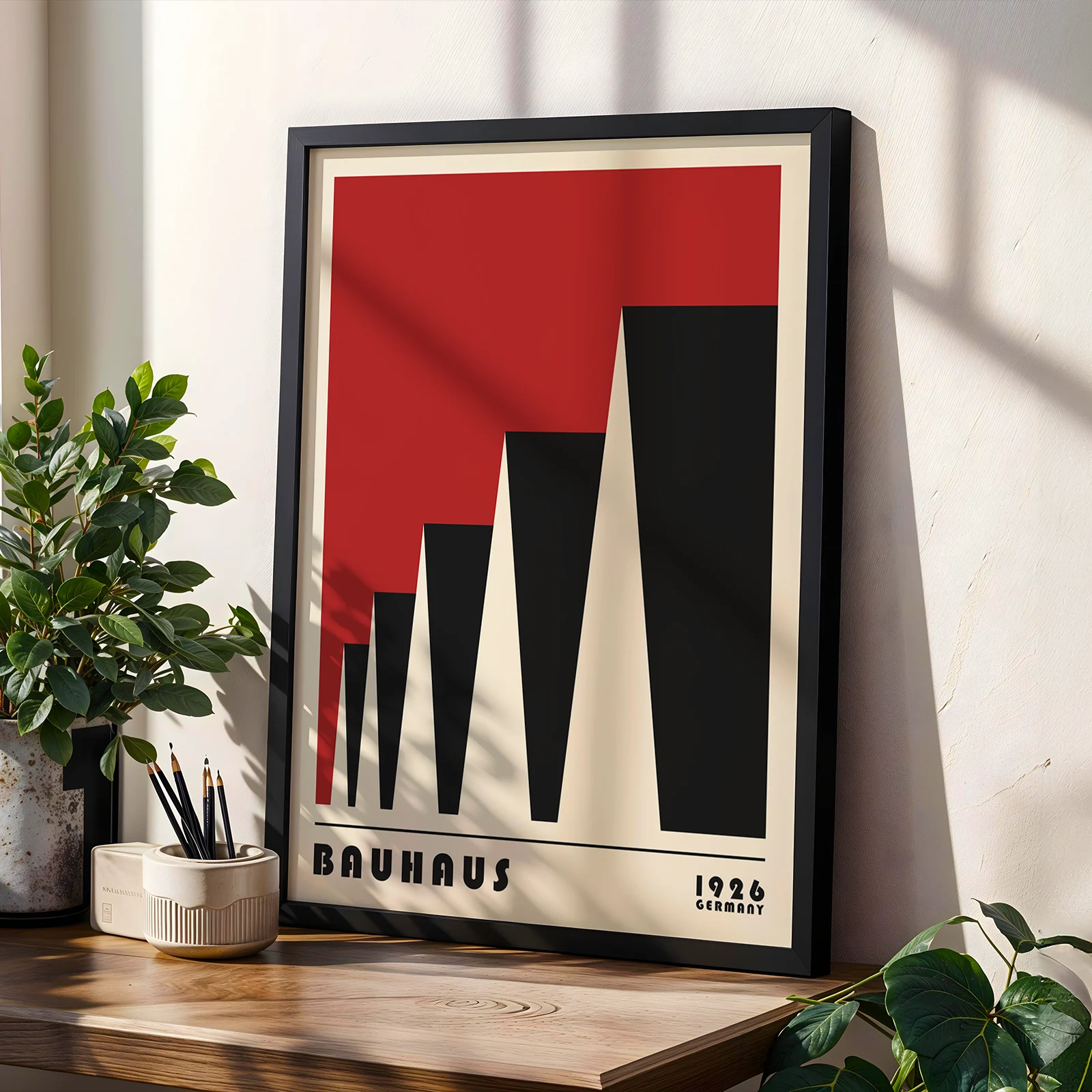 Add a bold style statement to your home with this unique Bauhaus poster 1923, where strong black triangles soar across a deep red sky—reminding you of factory rooftops marching into tomorrow. “Factory Roofs” shows off the fun and power of pure, simple shapes, turning a classic idea into something fresh and clever. As geometric wall art, this piece slips right into any room, making your walls pop with smart design and a touch of playful charm. Let this Bauhaus poster 1923 spark new stories and creative ideas every day, proving that even sharp lines can feel warm and full of energy!