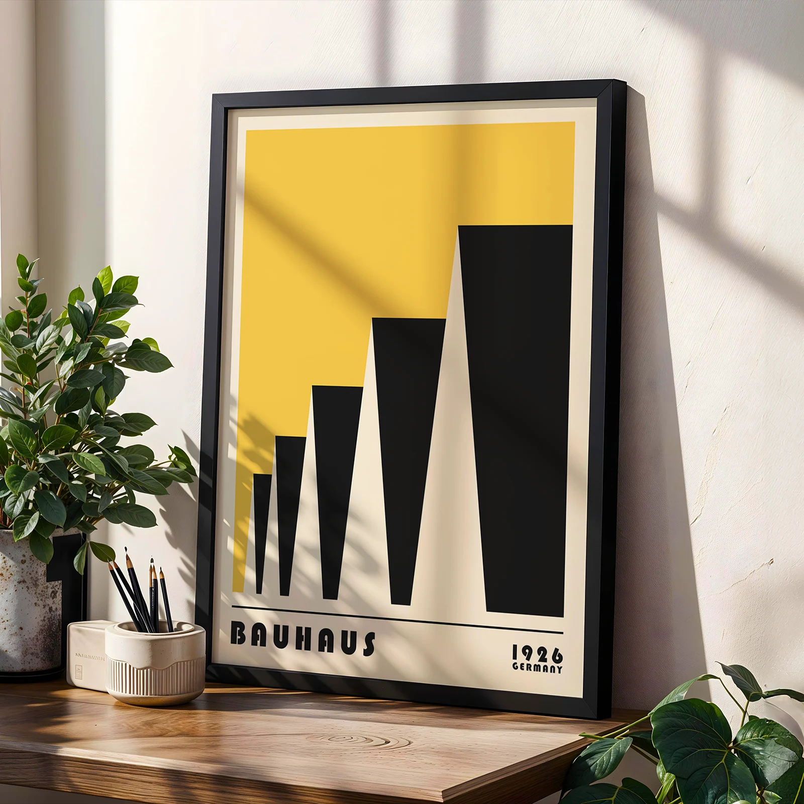 Give your home a playful touch of history with this Bauhaus poster 1923, where bold black triangles step up in a row against a warm yellow backdrop, echoing the rooftops of a modern cityscape. “Factory Roofs” takes simple shapes and turns them into something smart, fun, and full of movement—just what timeless design is all about. As Mid Century wall art, this print is a perfect fit above your couch, by your workspace, or in any spot that needs a little creative boost. Let this Bauhaus poster 1923 show how even the most basic forms can bring fresh energy and timeless style right into your everyday space.