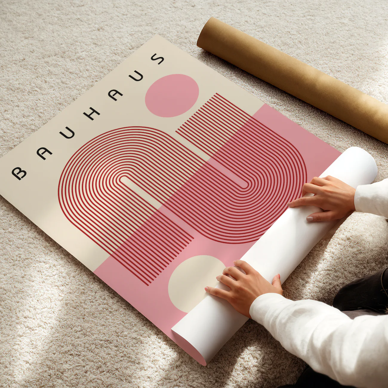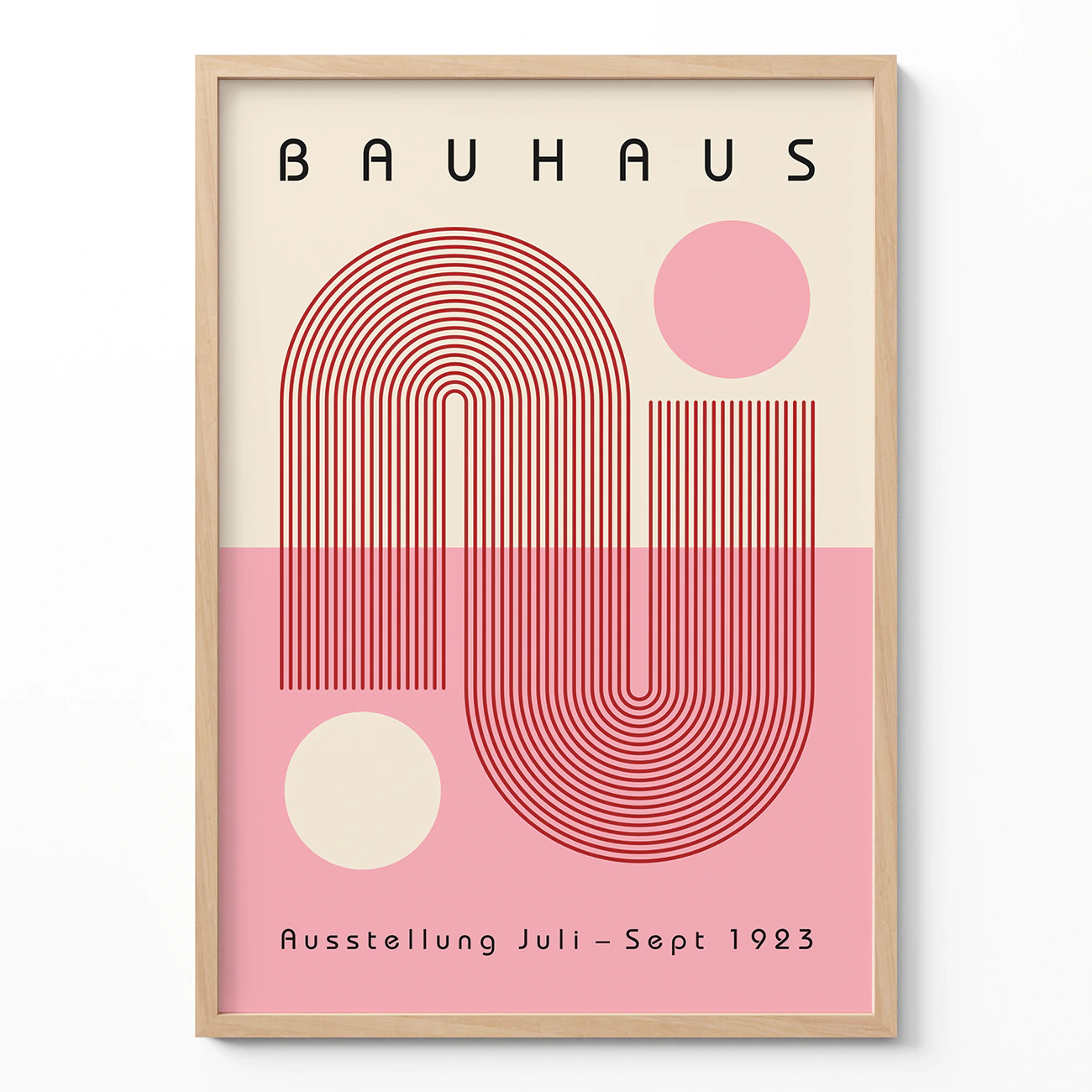 Bauhaus vintage poster fills your room with gentle curves and charming colors that catch the eye. Titled “Winding Path,” this design blends soft pink blocks with smooth red lines that flow like a ribbon through space. Each circle and curve shows expert balance, turning simple shapes into something special. As a retro art print, it works perfectly above a sofa, in a bedroom, or along a hallway, adding a touch of history without being loud. The cream and pink background keeps everything soft and welcoming. Trust this Bauhaus vintage poster to bring warmth, charm, and a hint of playful style to any wall in your home.