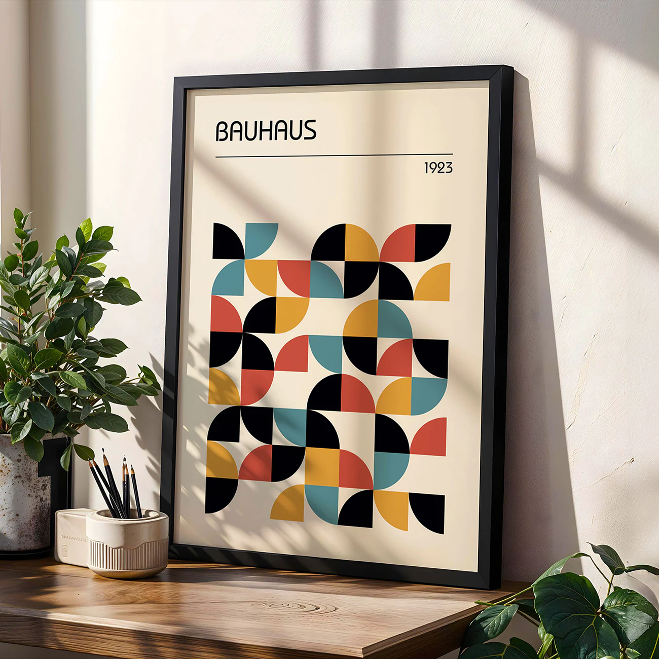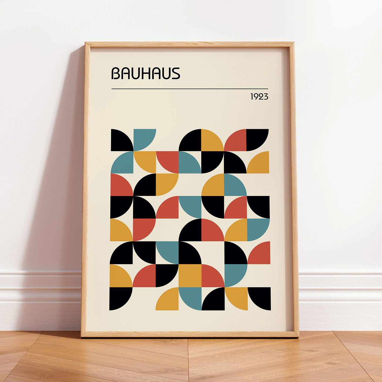 This Bauhaus wall art is all about playful geometry and clean, confident style. Bold shapes in mustard yellow, terracotta, teal, and black line up in a pattern that feels both rhythmic and spontaneous—exactly the kind of design that made Bauhaus legendary. The crisp “BAUHAUS” headline and subtle “1923” detail up top give it that nod to history, while the layout keeps things feeling fresh and modern. Whether you’re after a statement piece for your living room or a subtle pop of color in your office, this minimalist Bauhaus poster brings a shot of energy and timeless design to any space. It’s Bauhaus wall art that’s simple, striking, and always in style.