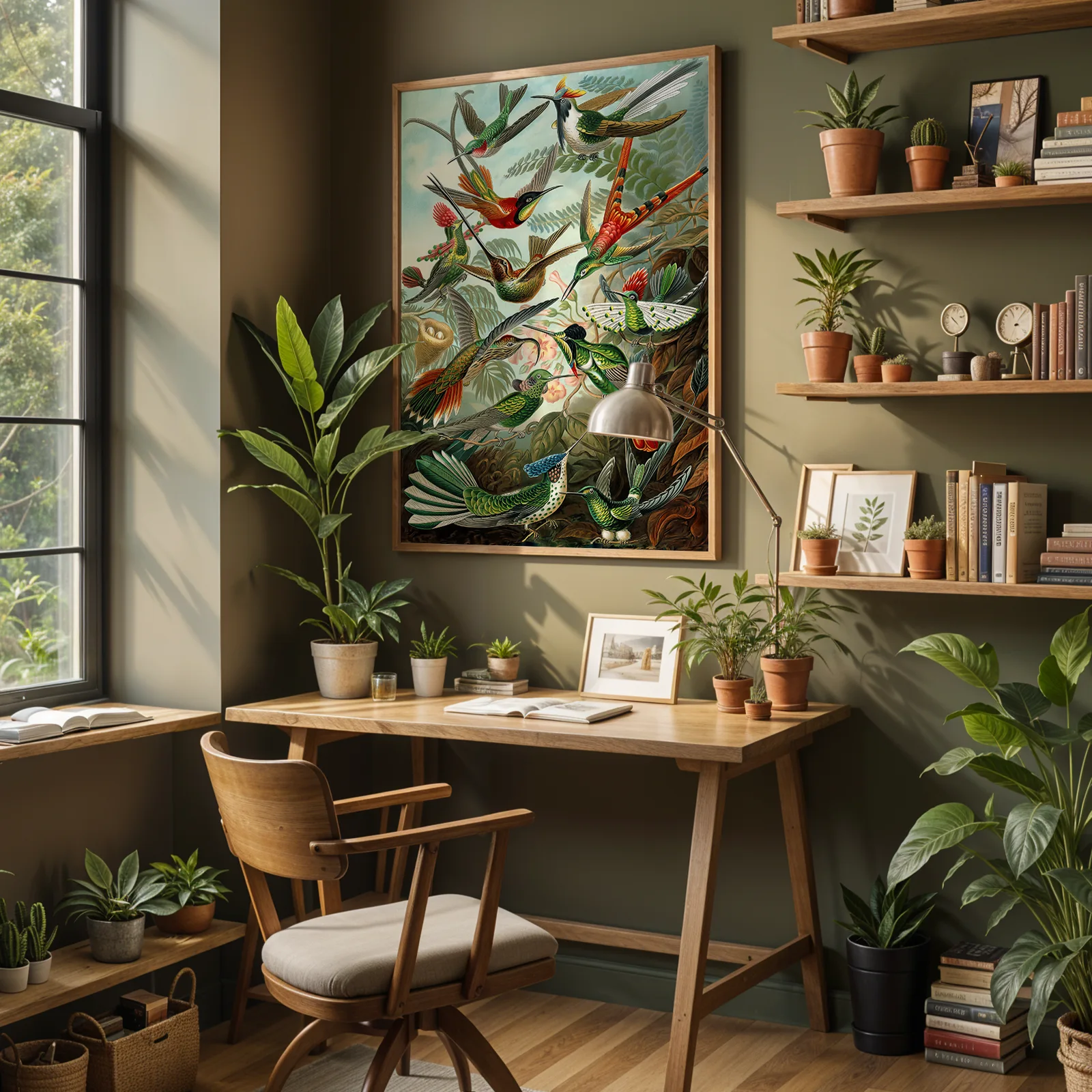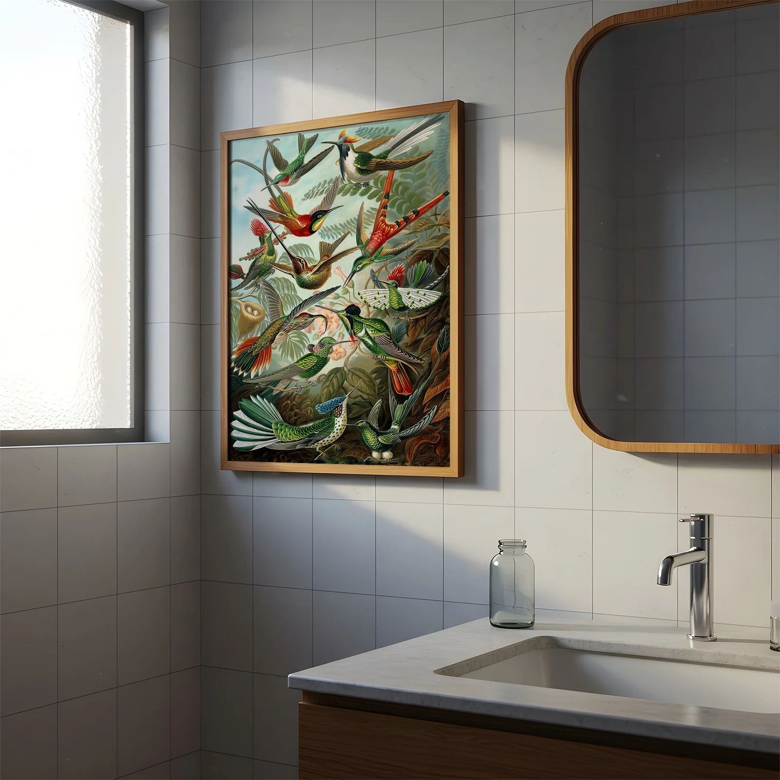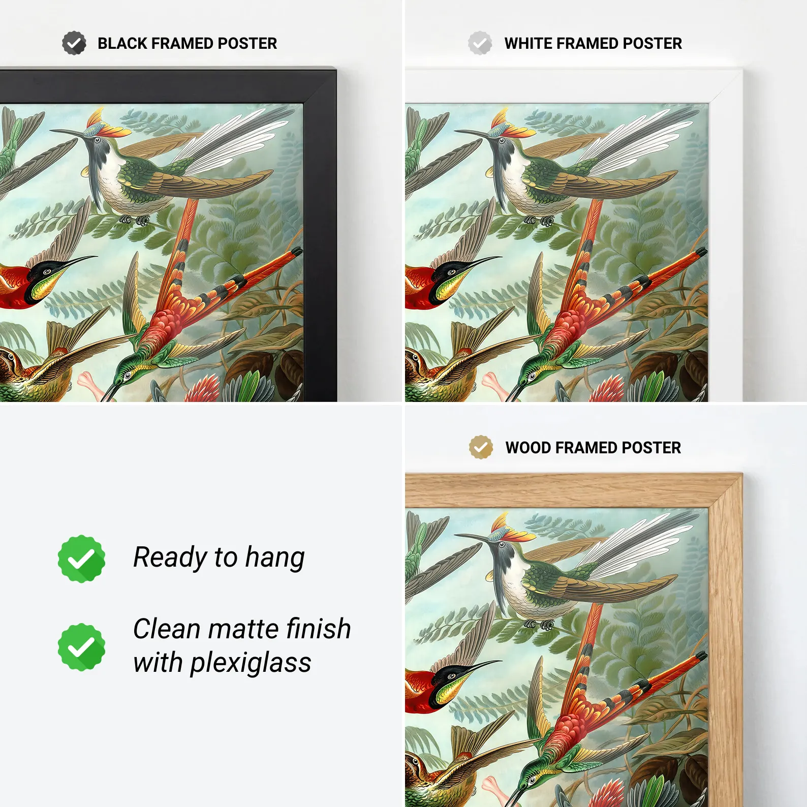 This birds of paradise poster by Ernst Haeckel bursts with color and movement, featuring a stunning collection of rare tropical birds in flight. Each bird is illustrated with fine detail and vivid tones, reflecting Haeckel’s love for both nature and art. It’s a perfect choice for adding a lively and exotic touch to your space, whether it’s a living room, creative studio, or even a kid’s room. Printed on high-quality paper, it captures every graceful feather and hue. Bring nature’s brilliance into your home with this beautiful birds of paradise poster.