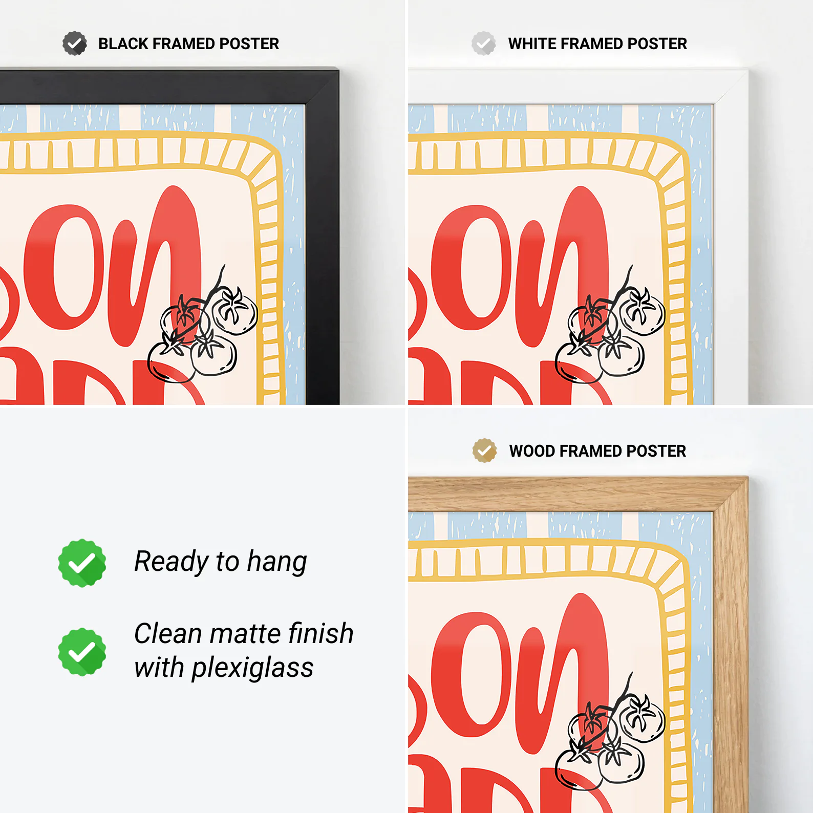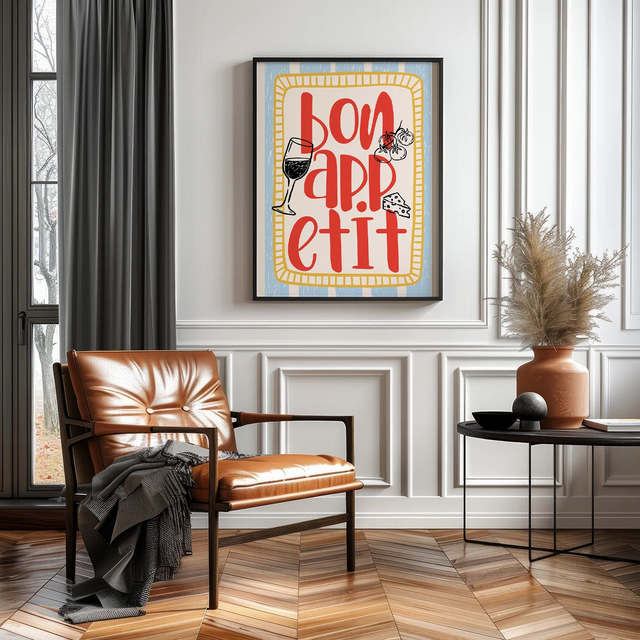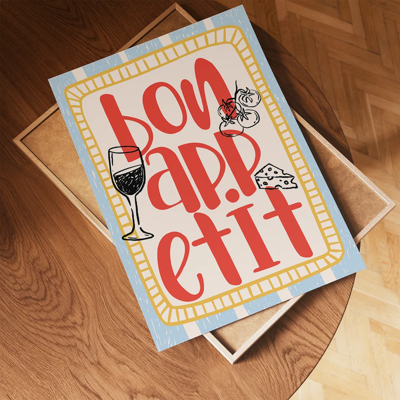 This Bon Appétit print adds a touch of French charm to your kitchen or dining space. With bold red lettering and fun illustrations of wine, cheese, and tomatoes, it’s the perfect wall art for food lovers. Printed on high-quality matte paper, this playful and warm design brightens up any food-themed corner. Whether you love to cook, host, or just enjoy good food, this Bon Appétit print is made to set the mood.