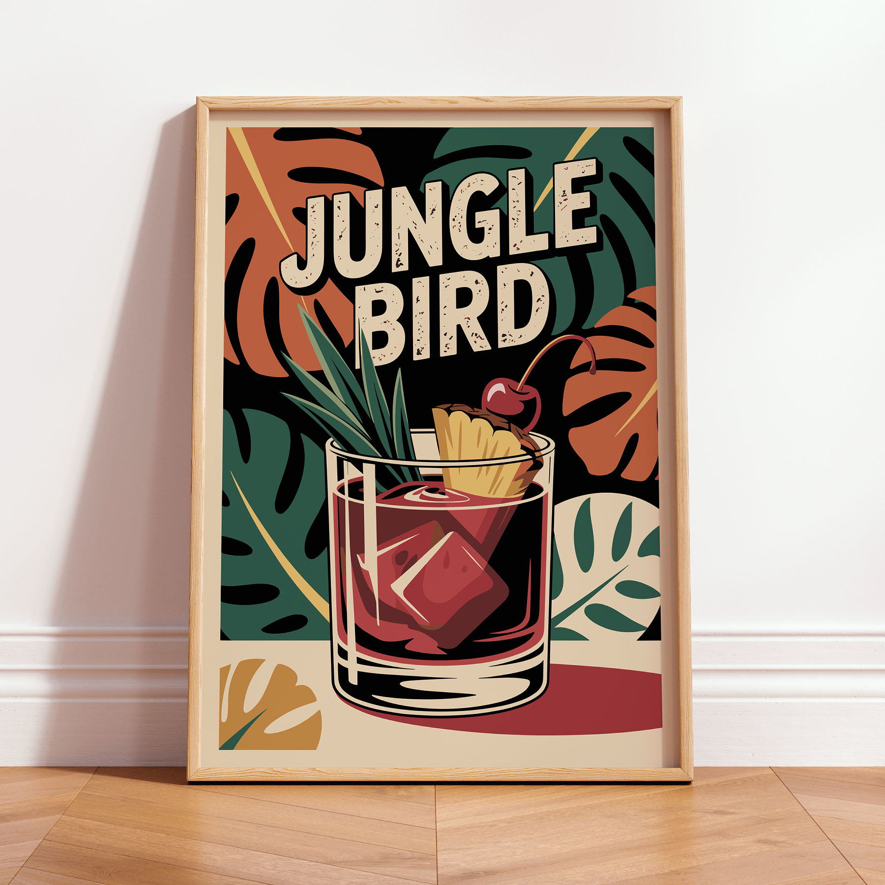 This cocktail poster shows the Jungle Bird drink in a simple and tropical style. The dark red cocktail is in a glass with pineapple, cherry, and palm leaves in the background. The bright colors make this poster perfect for your kitchen, bar, or café. It is printed on thick matte paper, so it looks nice and lasts a long time. If you want a picture that adds color and tropical feeling to your wall, this cocktail poster is a great choice.