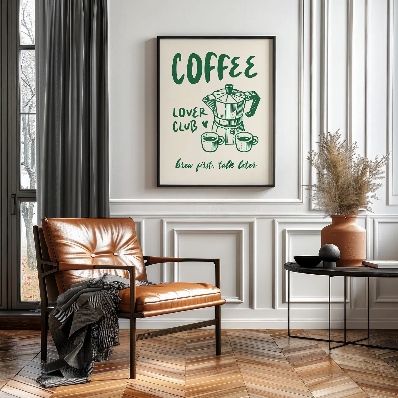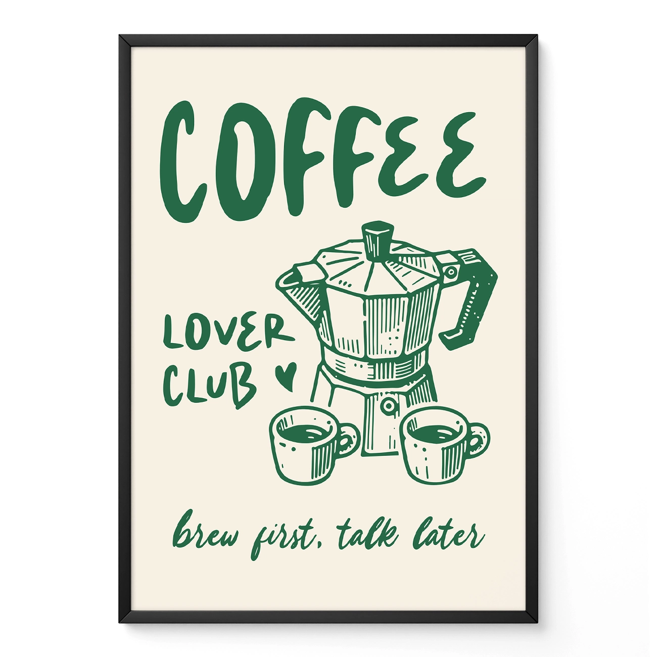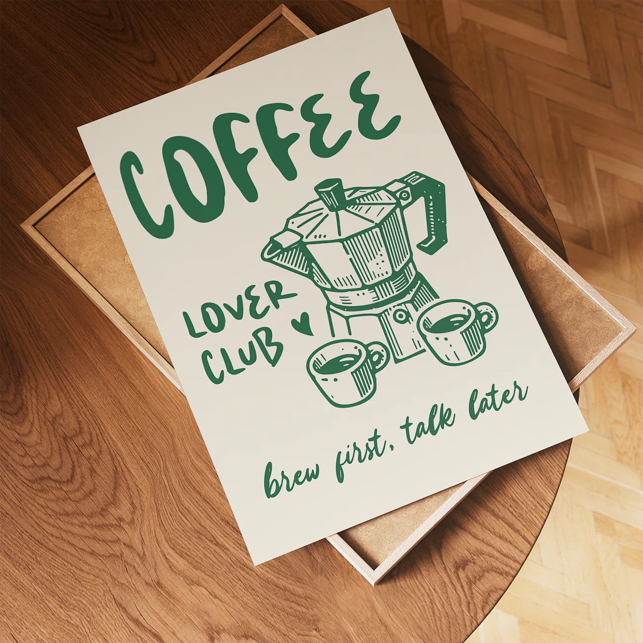 This coffee print is perfect for anyone who lives by the motto “brew first, talk later”. Featuring a moka pot and two steamy cups, it’s a quirky and bold piece that belongs in any coffee lover’s kitchen, office, or café. The playful message “Coffee Lover Club” makes it an excellent gift for baristas, caffeine enthusiasts, or anyone who needs their morning ritual. Printed on premium paper, it offers a high-quality finish and vivid colors. Whether you hang it by your coffee station or gift it to a fellow espresso fan, this coffee print will always deliver a smile. Join the club – caffeine first, conversation second!
