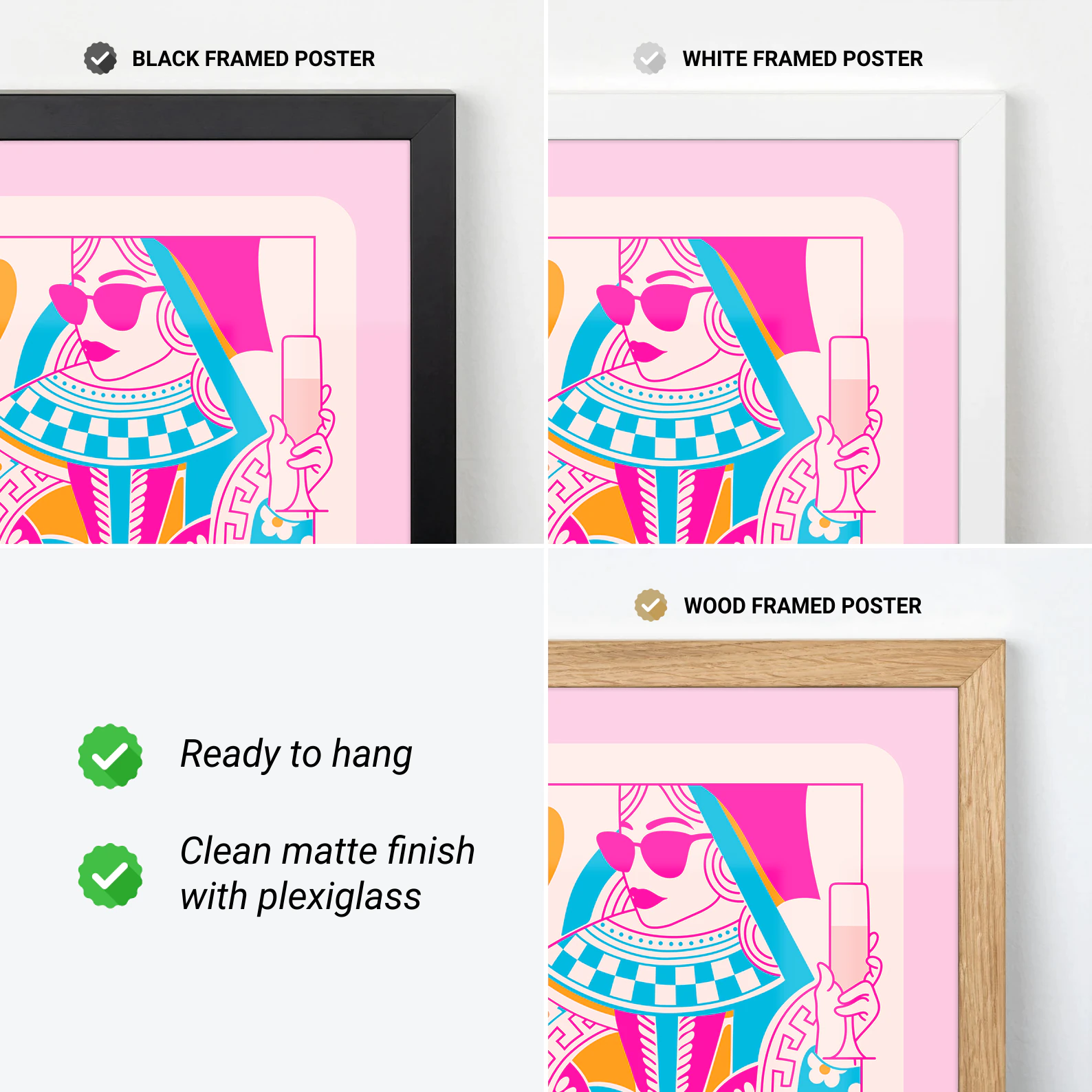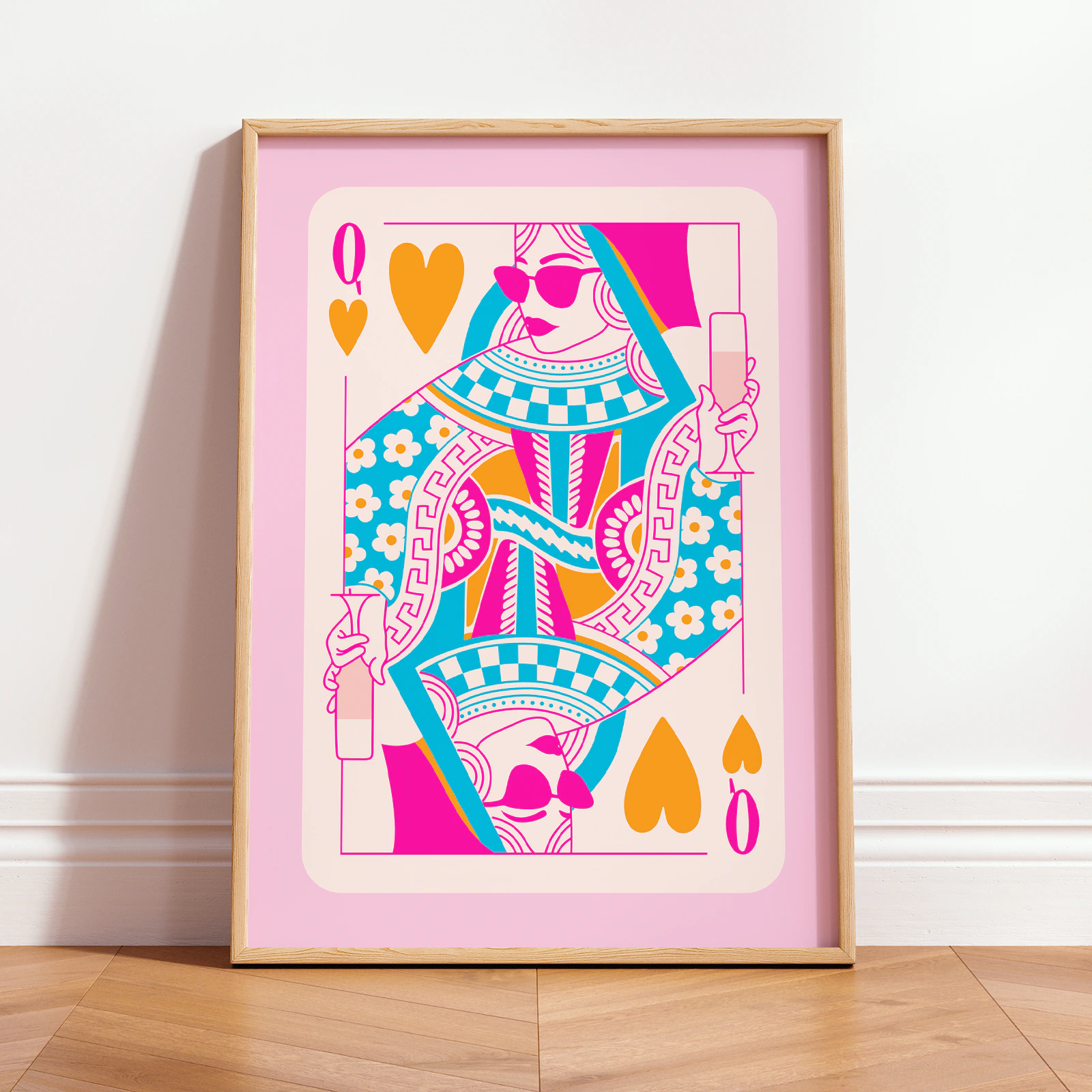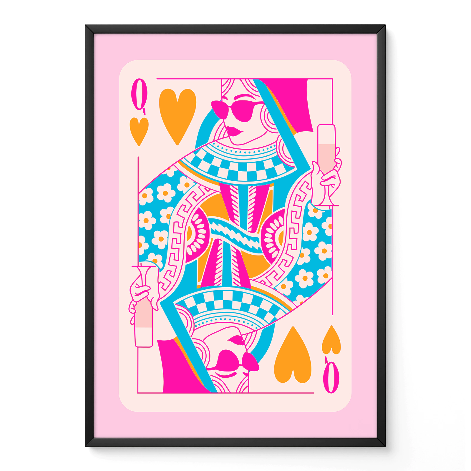 Add a burst of fun and personality to your space with this playing card art print featuring a bold, modern Queen of Hearts. Vibrant colors, geometric patterns, and playful details—like the queen sipping a drink—make this poster a perfect blend of classic card design and contemporary flair. It’s ideal for game rooms, bedrooms, or creative offices. This high-quality playing card art print is made on thick matte paper and looks great both framed or unframed. Whether you’re a fan of cards, color, or quirky art—this piece is a guaranteed conversation starter.