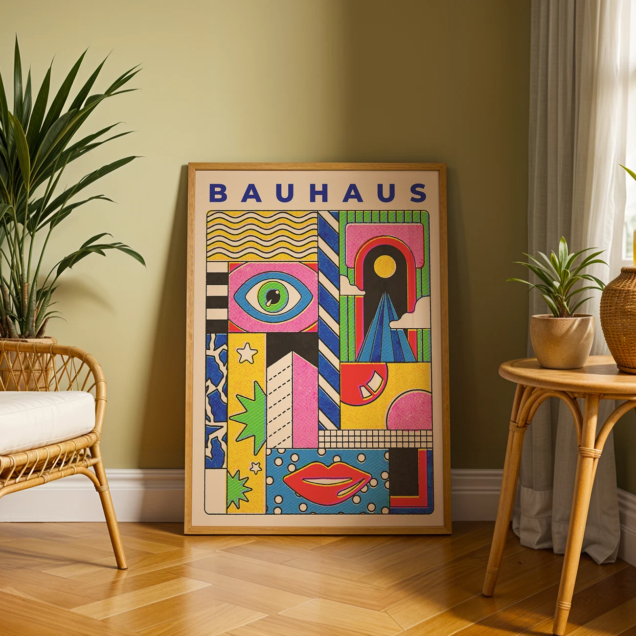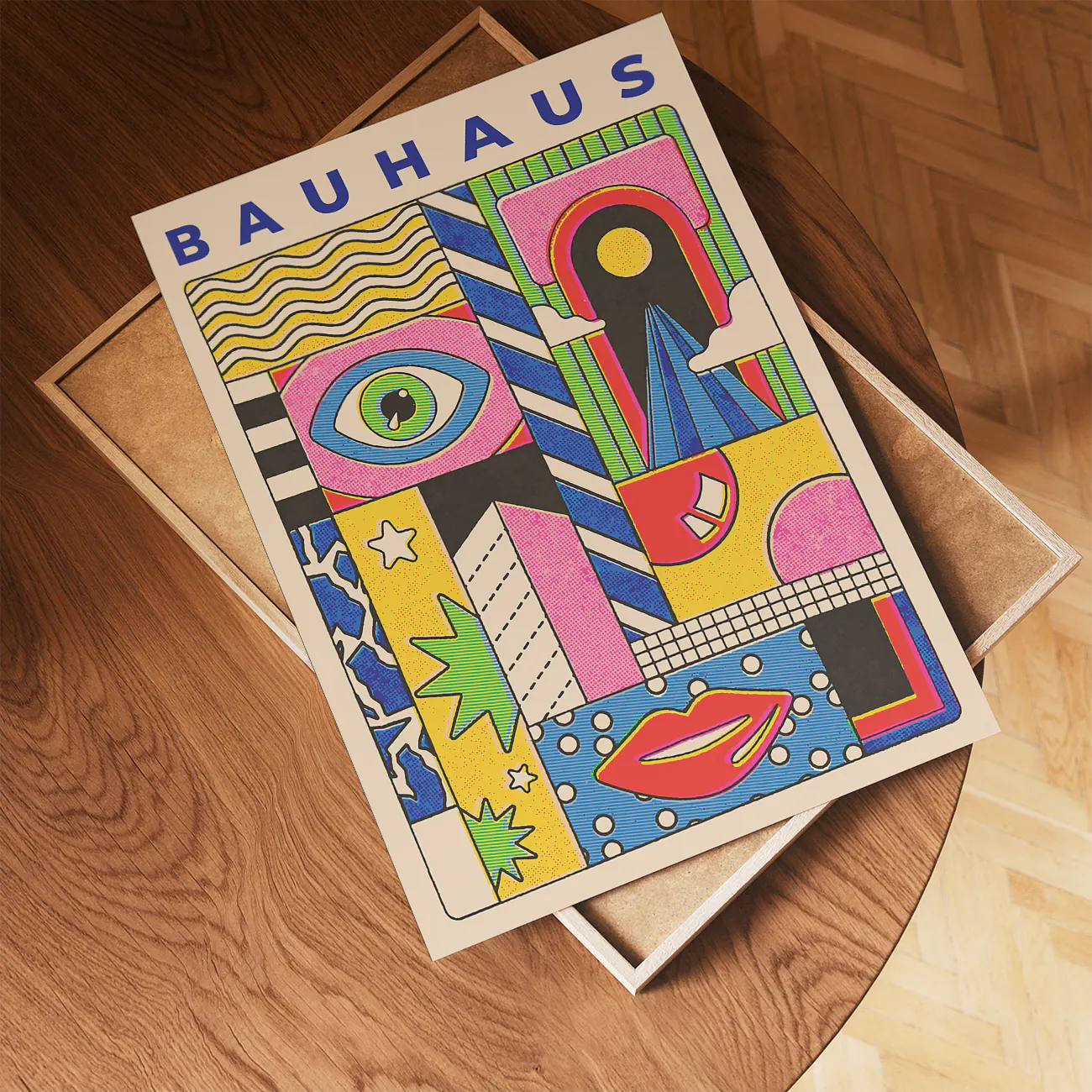 This colourful abstract wall art is a fun, bold take on Bauhaus-inspired design. Filled with playful shapes, textures, and bright pop-art colours, it’s perfect for adding energy and personality to your space. Whether you hang it in a creative studio, modern apartment, or home office, it’s sure to be a conversation starter. Printed on high-quality matte paper, this piece blends style with durability. If you’re into design, colour, or just want something unique on your wall – this print is for you. Let this colourful abstract wall art bring brightness and movement to your room.