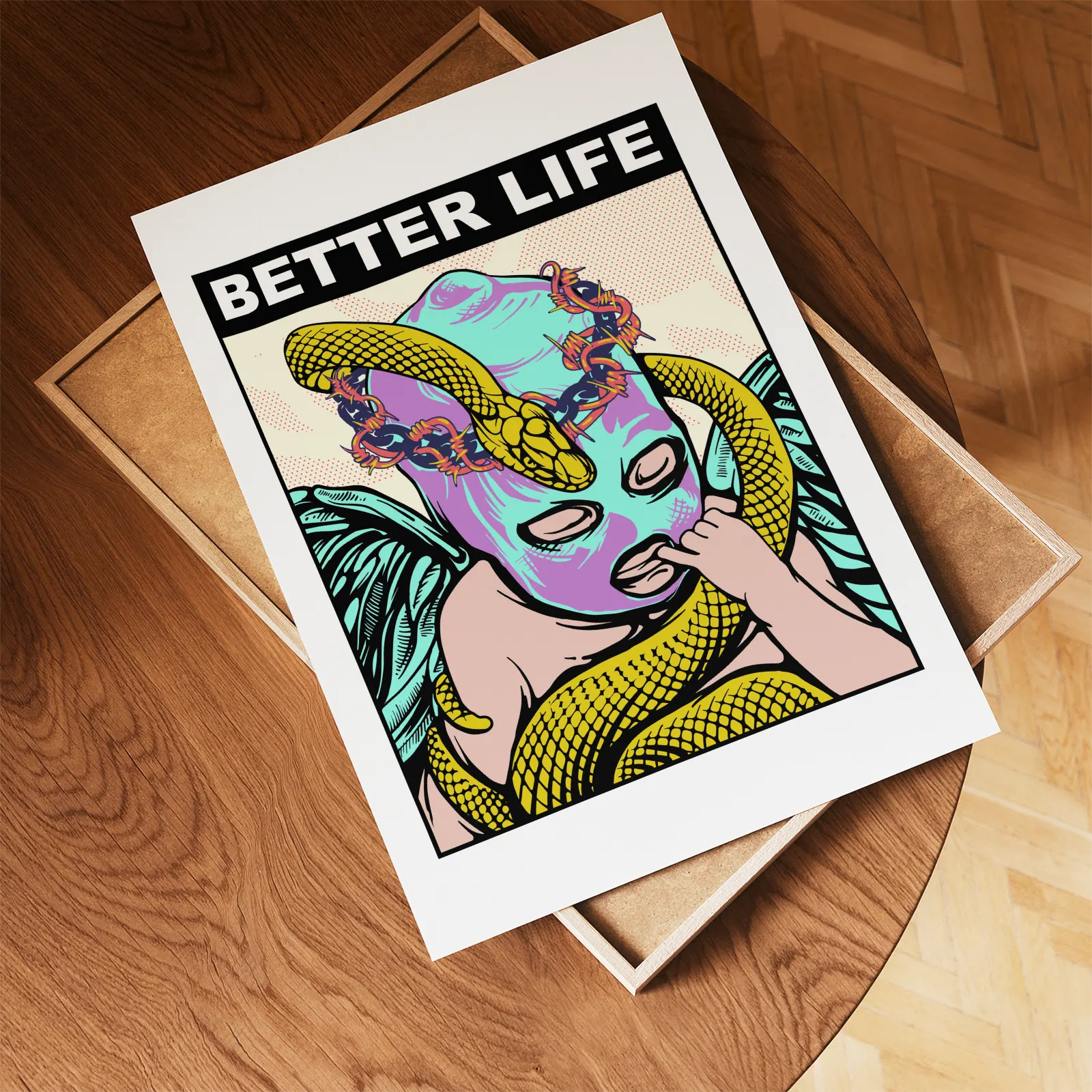 Bold and expressive, this cupid poster brings a striking pop art style to your wall. The unusual image of a winged cupid wearing a mask, wrapped with a snake and barbed wire, creates a dramatic and thought-provoking design. Bright colors and strong lines give the artwork a powerful graphic look that easily becomes the center of attention in a living room, studio, or creative workspace. Printed on high quality paper for a crisp finish, this cupid poster adds attitude and modern edge to your interior.