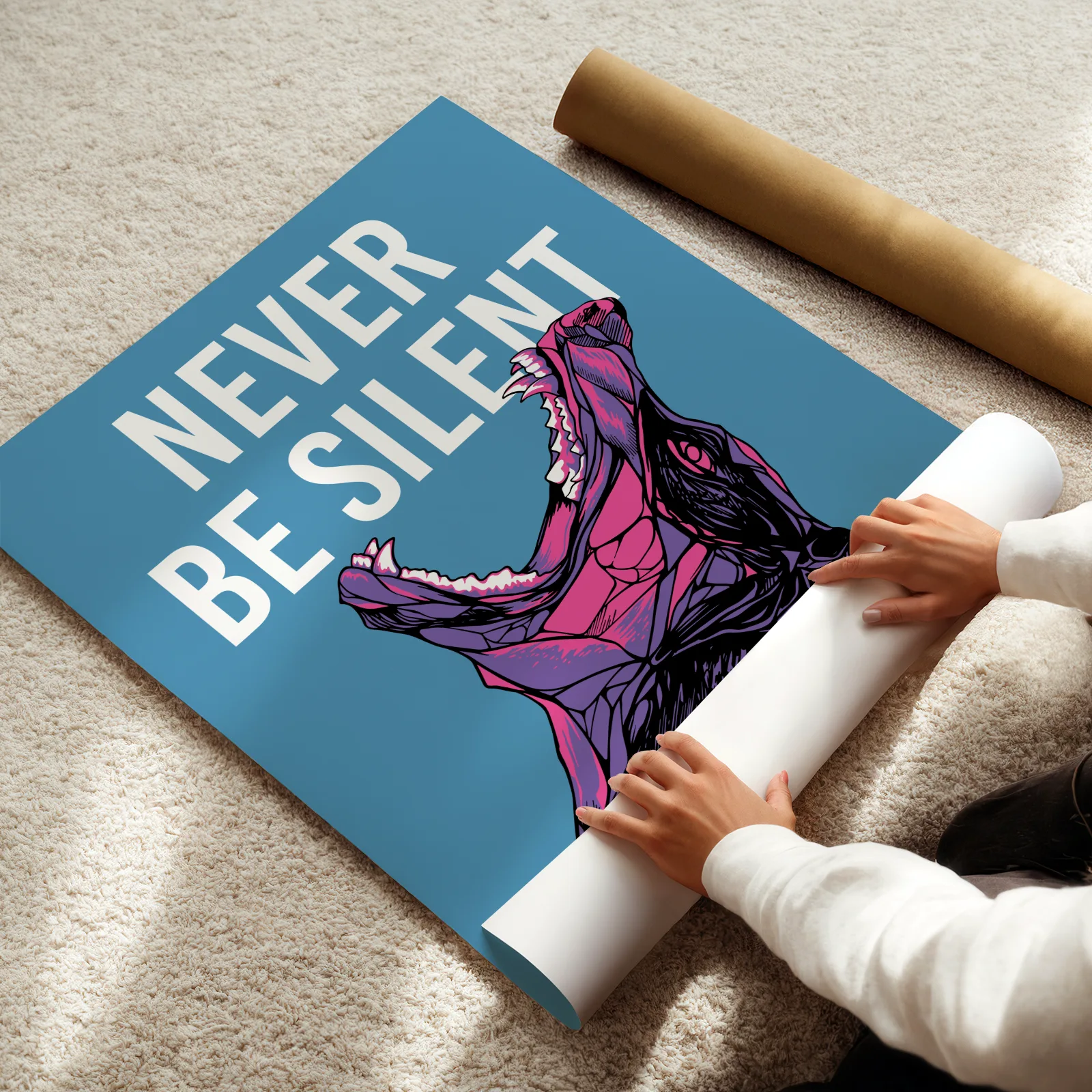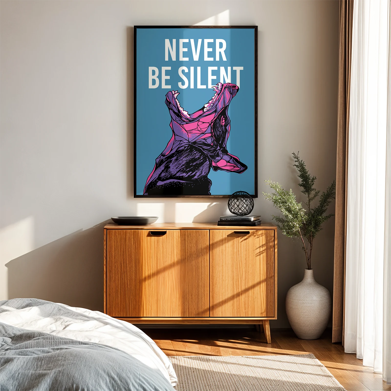 This poster shows a powerful Doberman with its mouth open and the bold phrase “Never Be Silent” above it. The Doberman poster combines strong illustration with a clear and expressive message. The blue background and vibrant colors create a striking contrast that makes the design stand out instantly. Its graphic style gives the poster an energetic and modern look. Printed on high quality paper, the Doberman poster works great in living rooms, studios, offices, or modern interiors that need a bold visual statement.