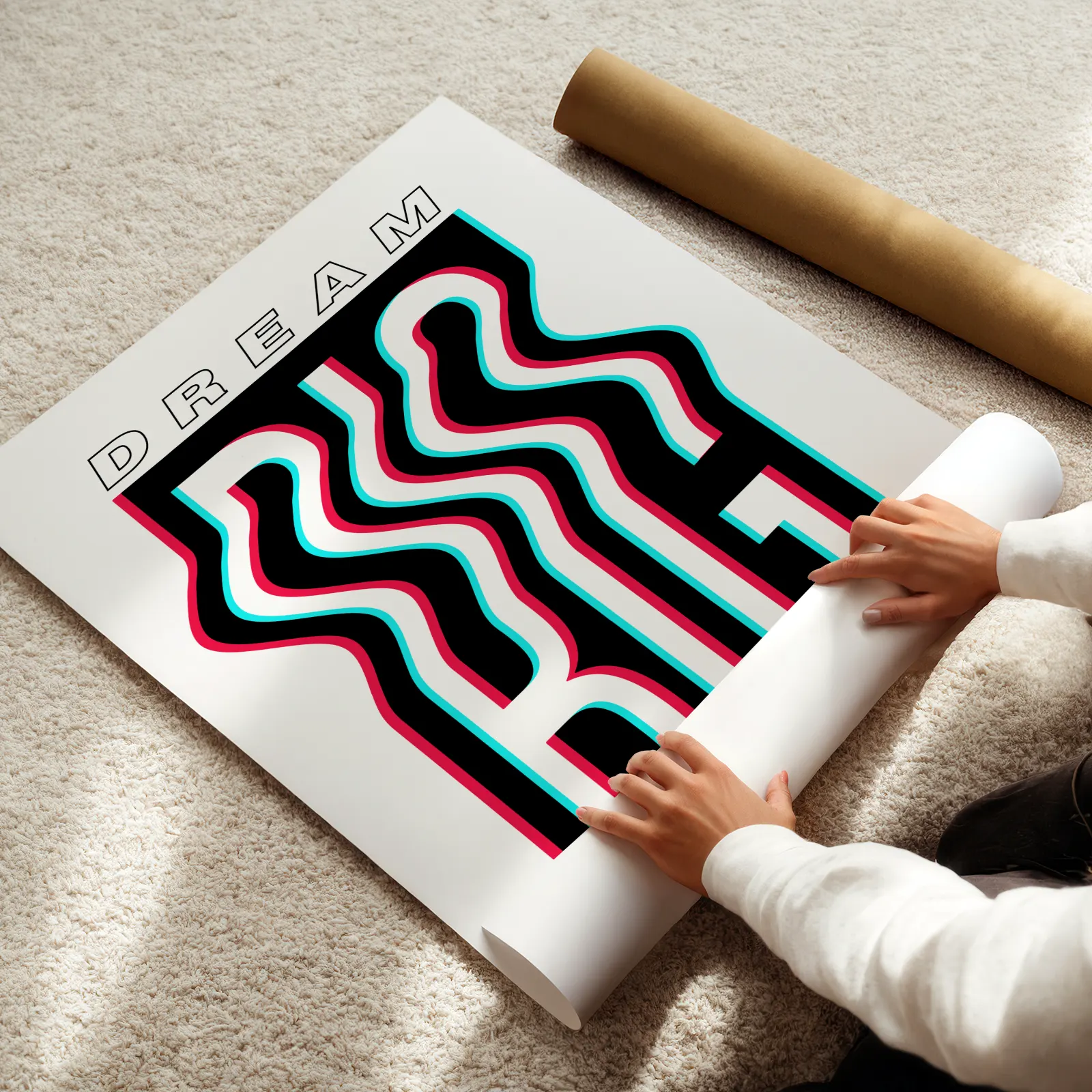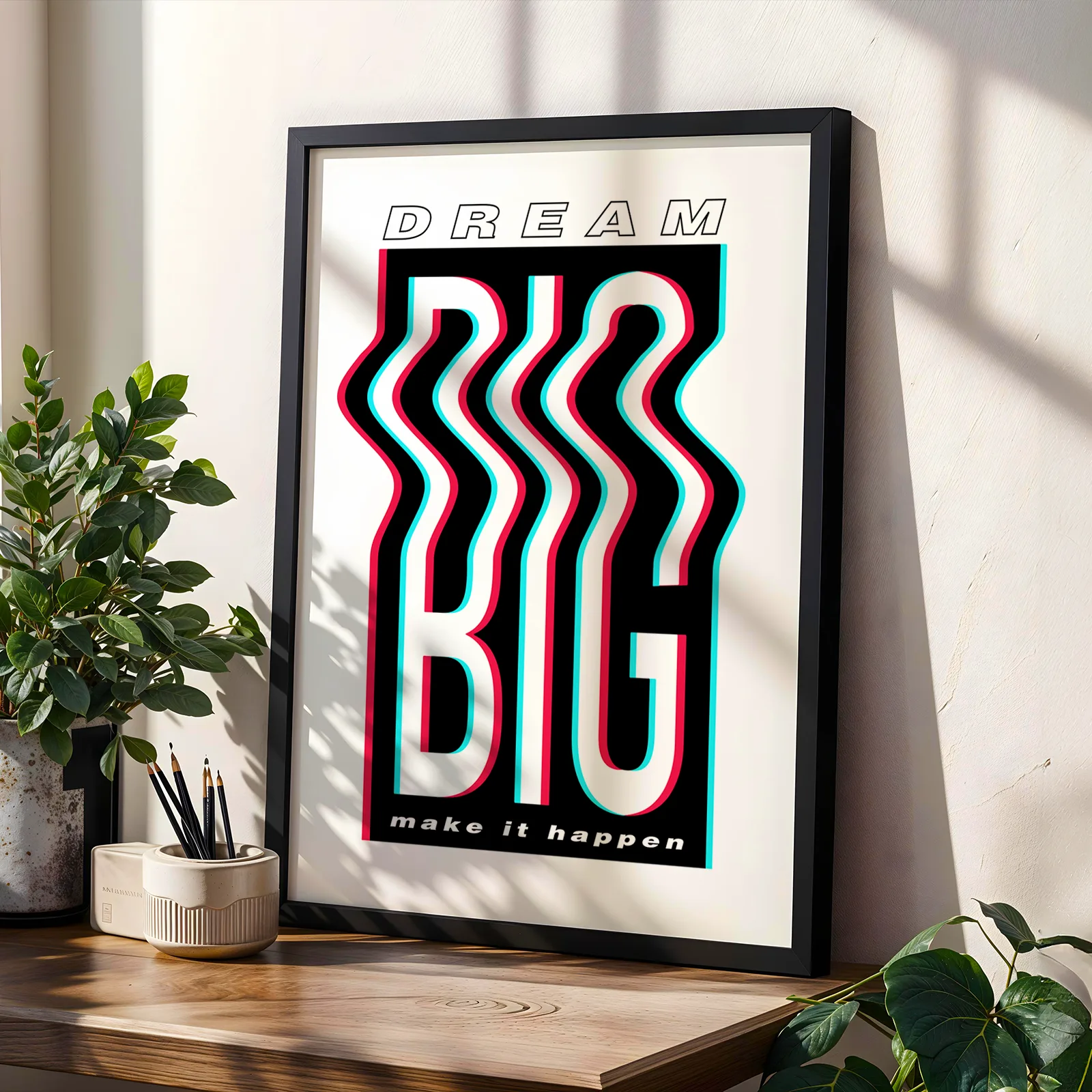 This poster features the words “Dream Big” with the phrase “make it happen” below. This poster delivers a clear motivational message through bold typography and a dynamic graphic style. Clean lines and contrasting colors give the design a modern and energetic character. Printed on high quality paper, the Dream big poster fits perfectly in offices, studios, bedrooms, or any space where inspiration and positive mindset matter.