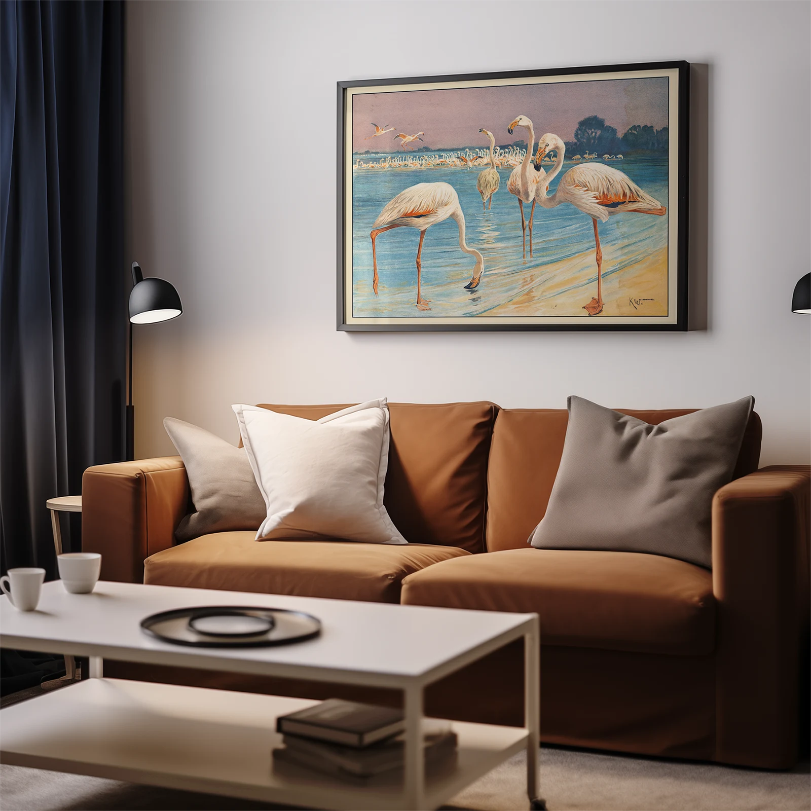 This elegant flamingo poster captures a calm coastal scene filled with soft light and gentle pastel tones. The early 20th century German artwork reproduction shows graceful flamingos standing in shallow water, with delicate reflections and warm sunset colors in the background. The balanced composition brings a peaceful feeling, making it perfect for a living room, bedroom, or beach house interior. Printed on high quality paper, this flamingo poster adds timeless beauty and a refined vintage accent to your wall decor.