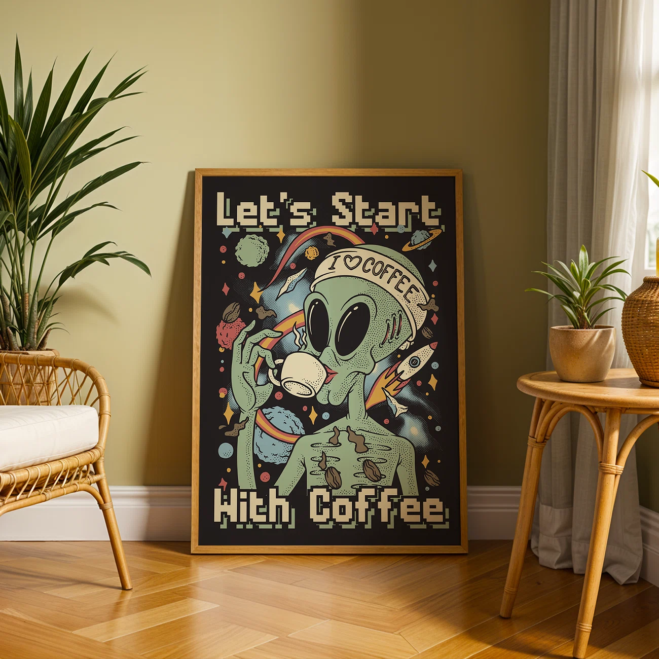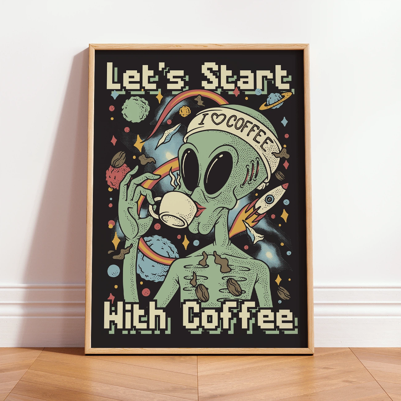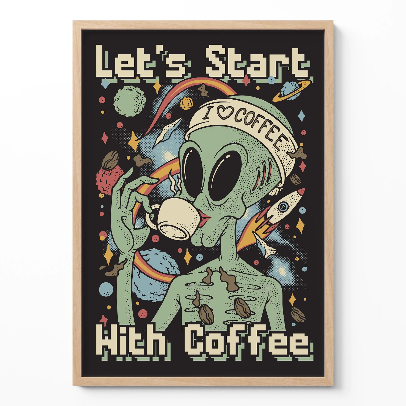 Funny Space Coffee Poster – Alien Art Print for Coffee Lovers