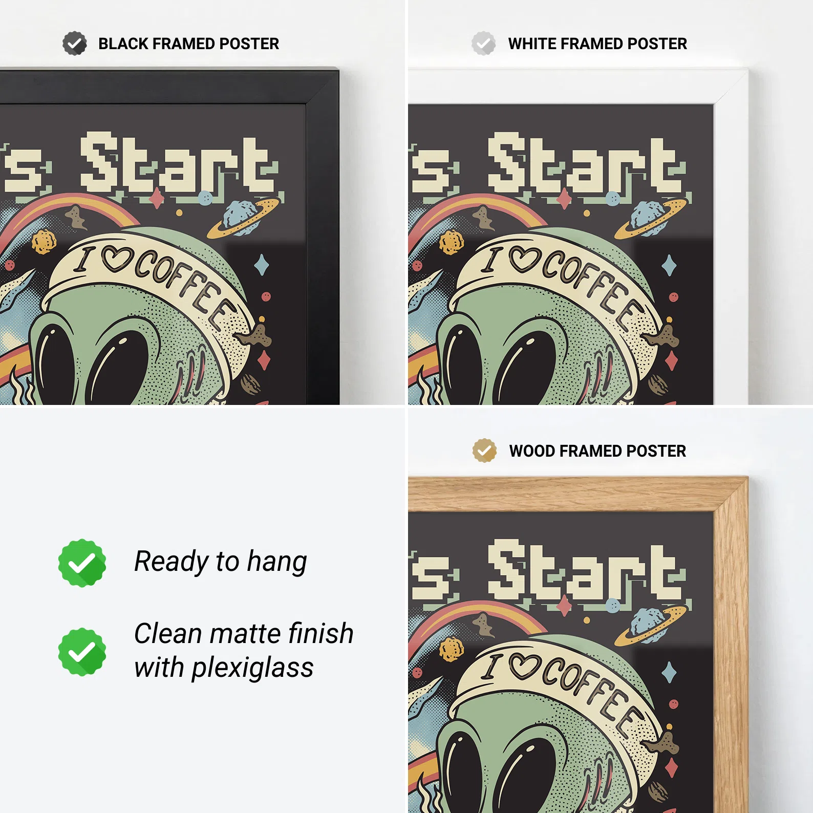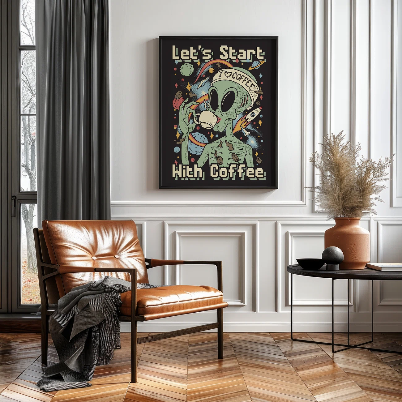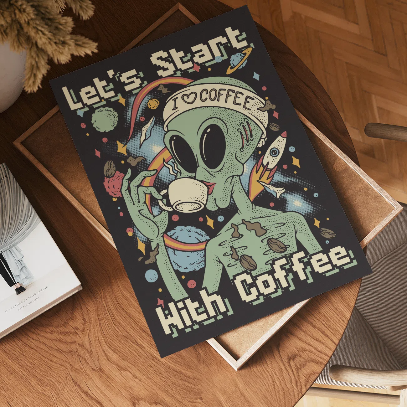 This colorful and playful coffee poster features a friendly green alien sipping coffee in outer space, surrounded by planets, rockets, and coffee beans. The text “Let’s Start With Coffee” and the alien’s “I ♥ COFFEE” headband make it a fun and quirky print for any coffee lover. It’s a perfect fit for kitchens, cafés, home offices, or creative workspaces that need an energy boost. Printed on high-quality matte paper, it’s made to last and look great on any wall. Add some intergalactic flavor to your day with this cheerful coffee poster.