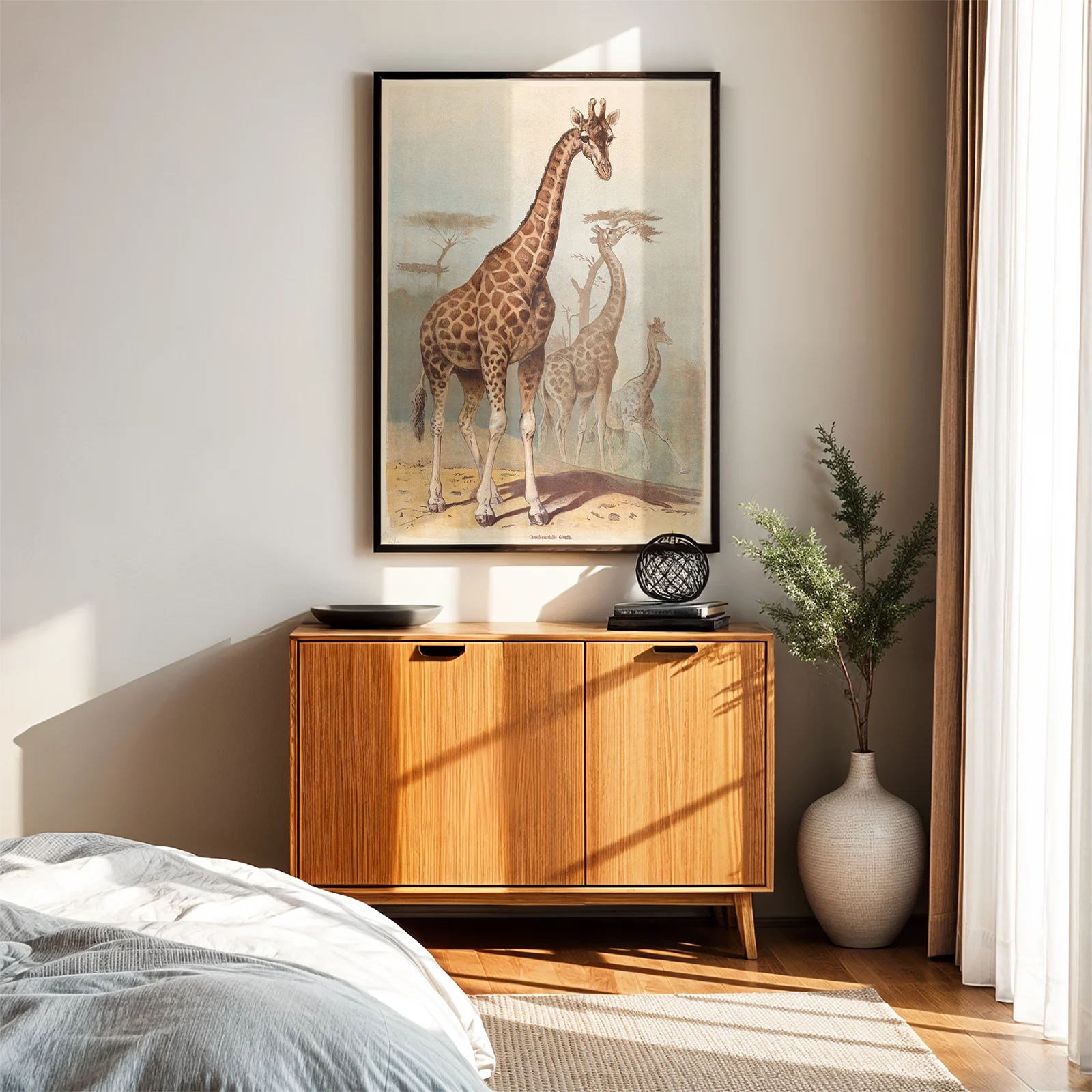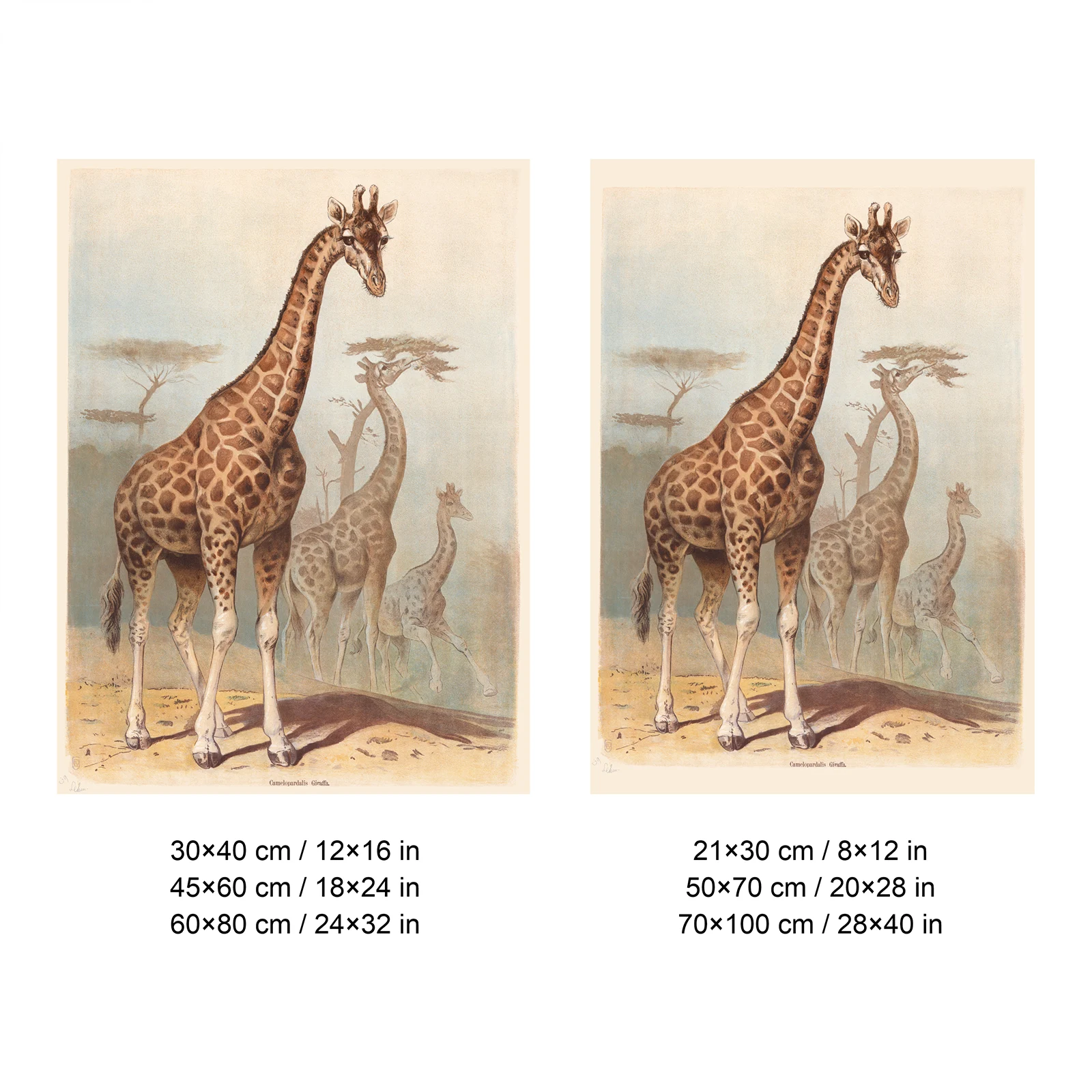 This graceful giraffe print captures the quiet beauty of the African savanna in warm, natural tones. The early 20th century German artwork reproduction shows a tall giraffe standing proudly in the foreground, while others appear softly in the distance, creating depth and movement. The gentle color palette and classic illustration style make it perfect for a living room, office, or study. Printed on high quality paper, this giraffe print brings timeless safari charm and elegant wildlife character into your interior.