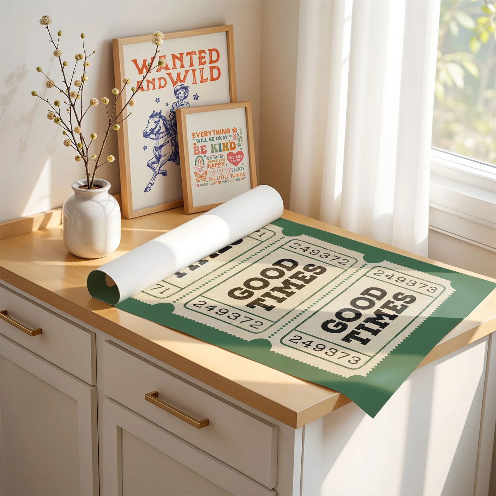 This retro ticket poster captures the simple charm of old cinema and event tickets, built around the bold and playful “Good Times” message. The design feels nostalgic and lighthearted, making it a great fit for a home bar, game room, living room, or creative workspace. The deep green background adds a relaxed vintage tone that pairs easily with both modern and retro interiors. Printed on high quality paper, the bold lettering stands out clearly in this retro ticket poster.
