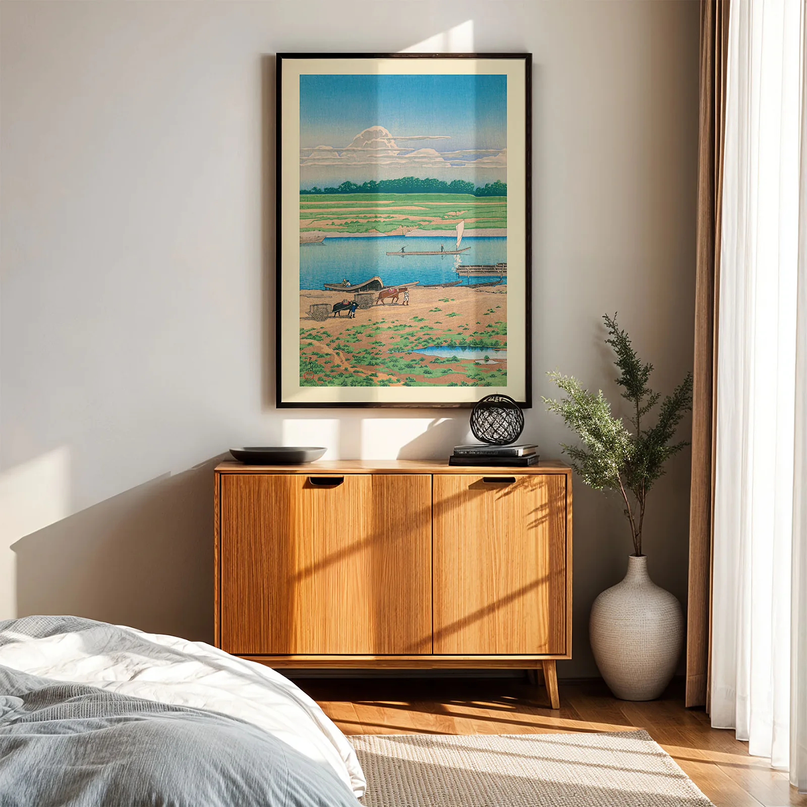 This Hasui Kawase print shows a quiet riverside scene with boats, animals, and people working near the water. Soft blue, green, and earth tones create a peaceful mood. The calm river reflects the sky, while gentle clouds float above the distant trees. This artwork captures the beauty of daily life in nature, inspired by traditional Japanese woodblock art. It’s perfect for creating a calm and warm atmosphere in your home. Printed on thick, high-quality paper, this Hasui Kawase print will stay beautiful for many years.