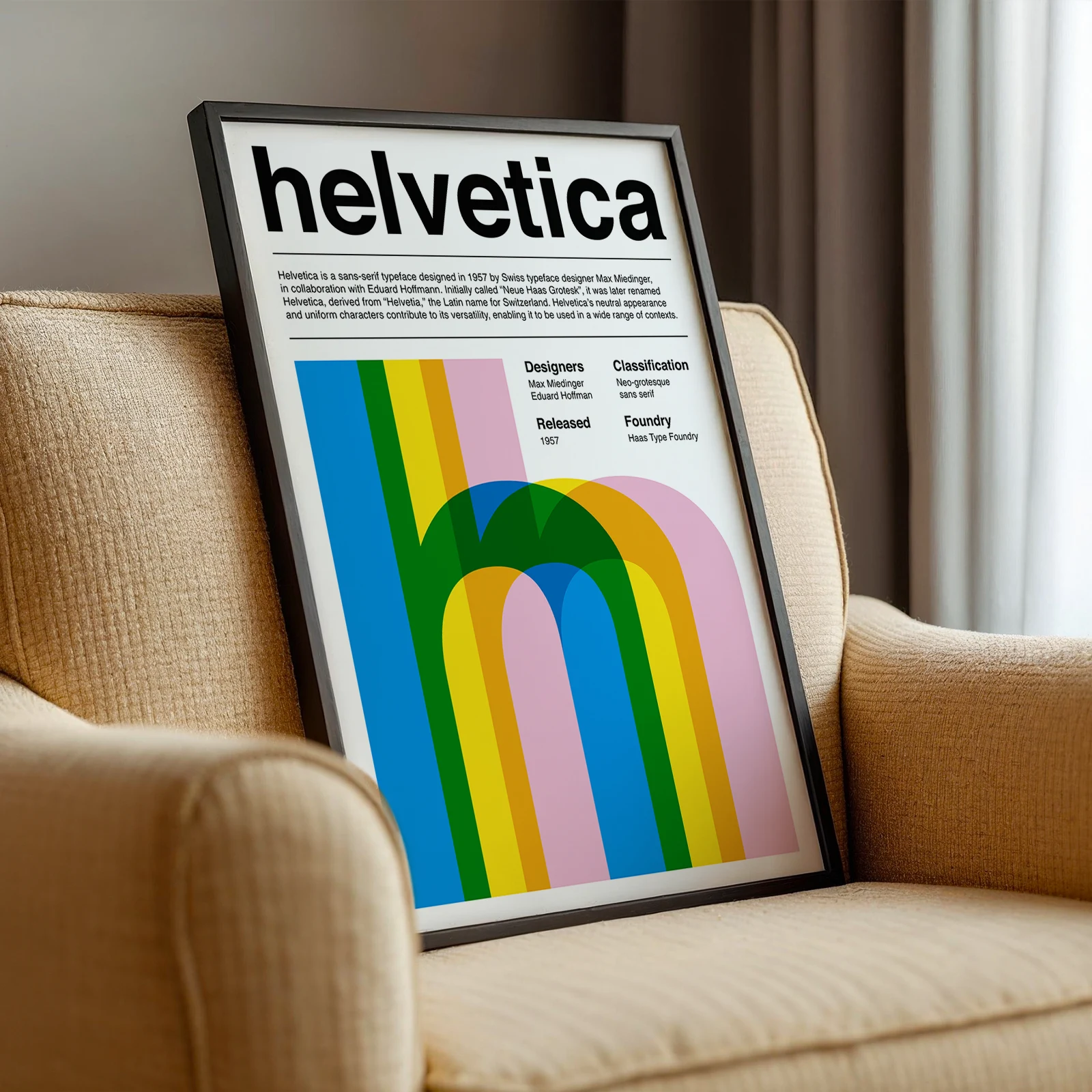 This poster is dedicated to the famous Swiss typeface Helvetica, one of the most influential fonts in modern graphic design. The Helvetica poster presents the classic typography together with a colorful graphic composition that highlights the shape of the letter “h”. Clean layout and simple design give the poster a modern and balanced look that fits many interiors. Printed on high quality paper, it works beautifully in studios, offices, or creative workspaces. For those who appreciate typography and design history, the Helvetica poster is a stylish addition to the wall.