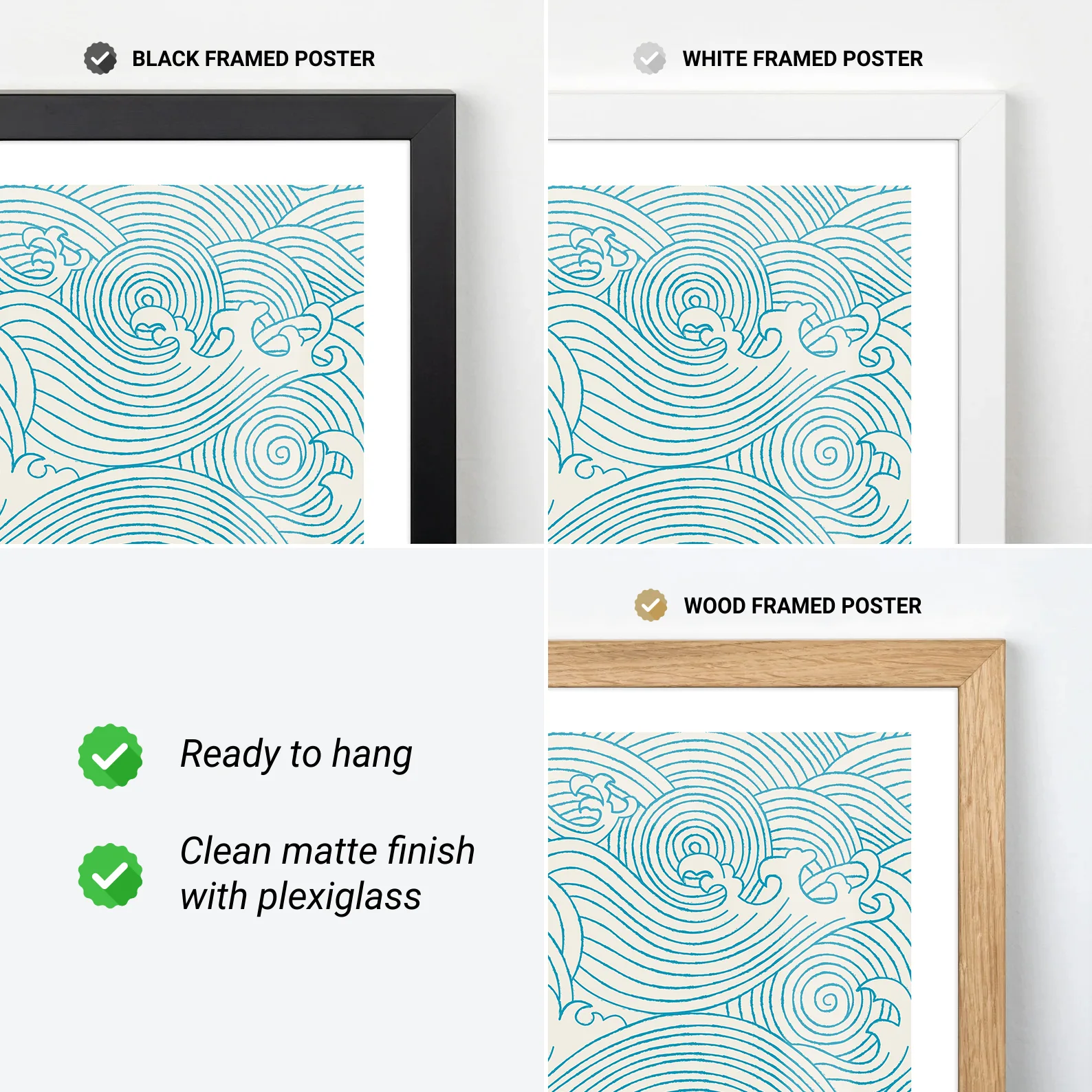 You can order our posters and canvas prints with or without a frame. The frames are made from wood and are 2 cm wide. Poster frames include a clear acrylic glass and all parts needed for hanging.