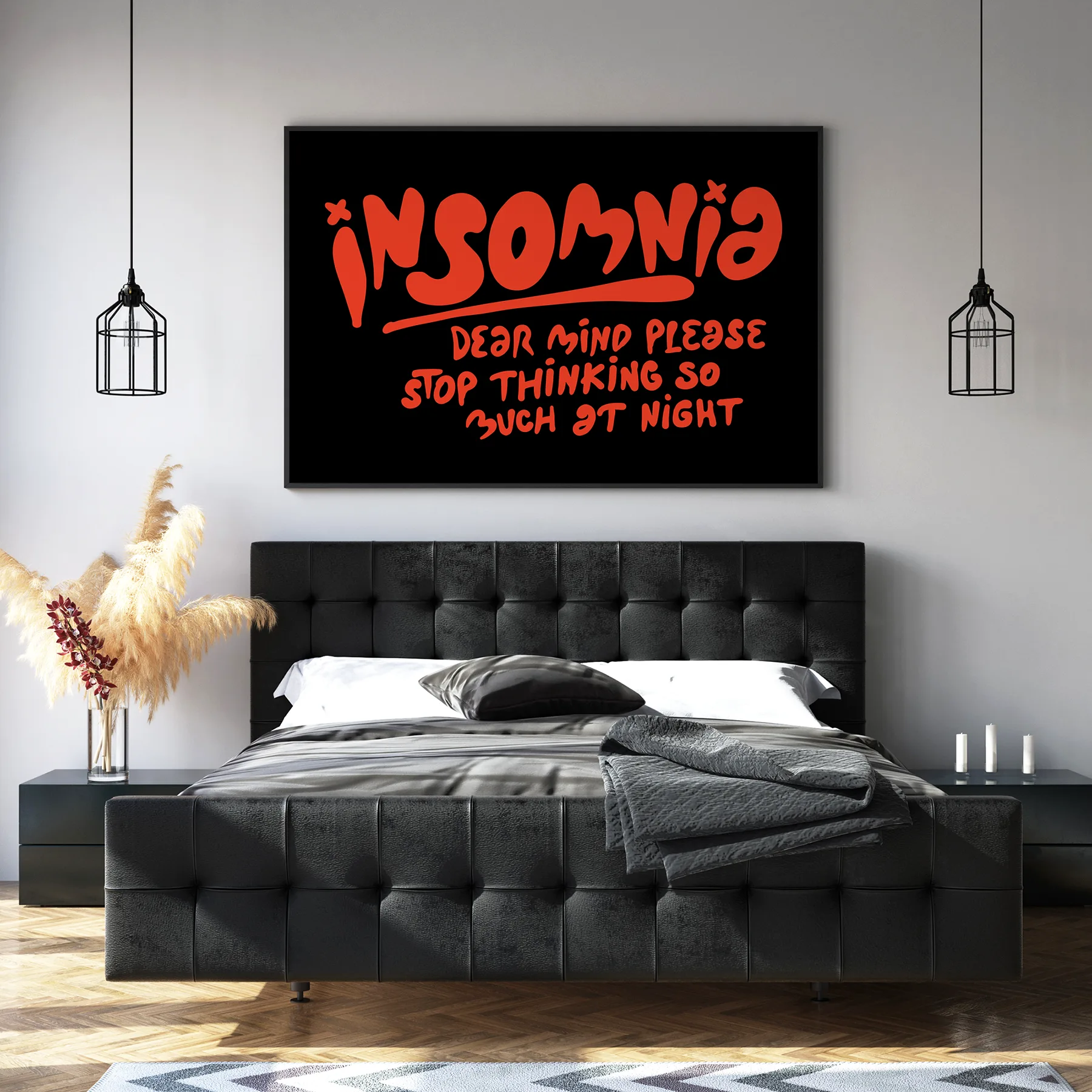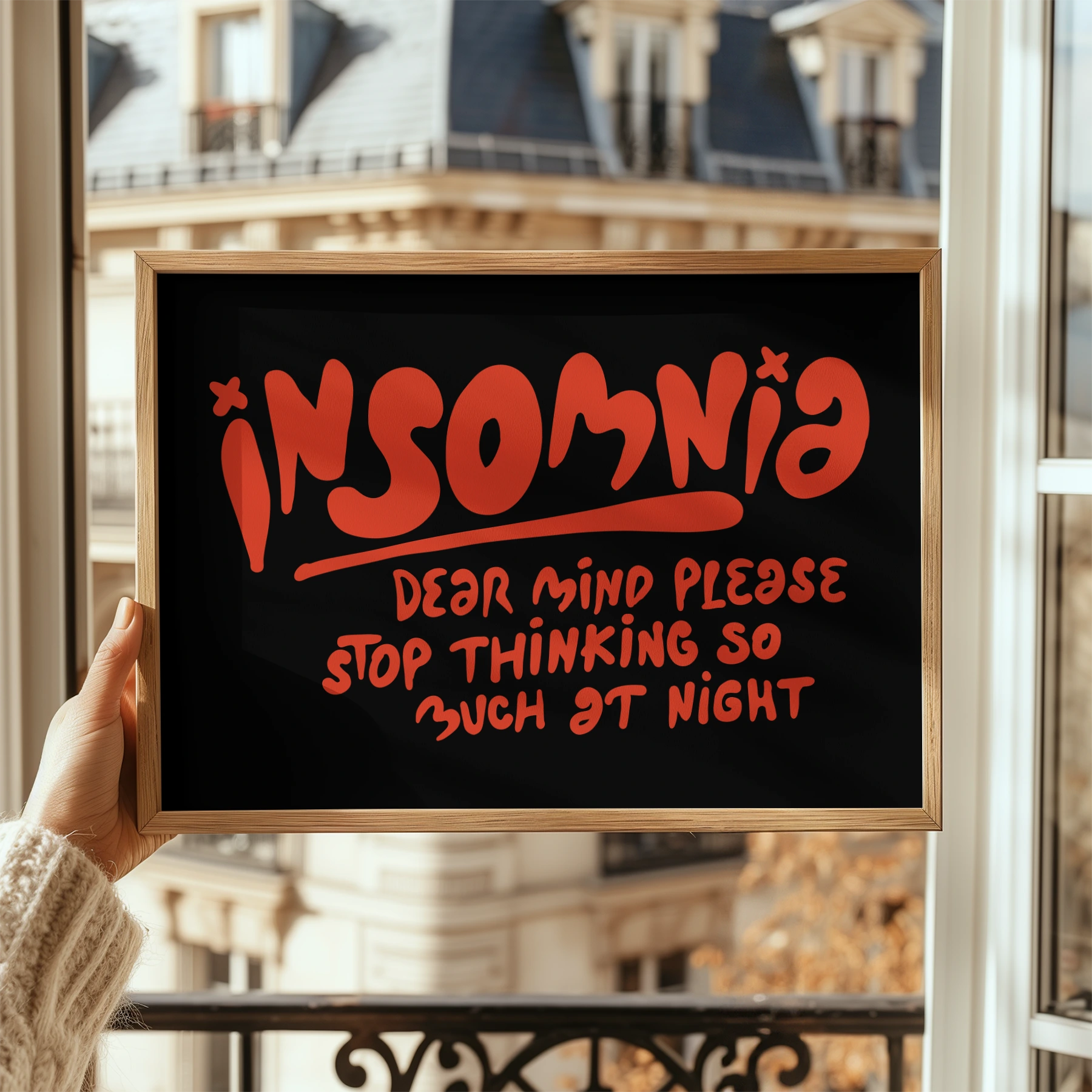This poster features the phrase “Insomnia – Dear mind please stop thinking so much at night” written in red typography. The quote poster has a playful and expressive style that many people can easily relate to. The strong contrast between the red lettering and black background makes the message stand out clearly on the wall. Printed on high quality paper, it fits perfectly in bedrooms, studios, or creative spaces. For anyone who enjoys humorous and relatable wall art, the quote poster adds personality to any room.