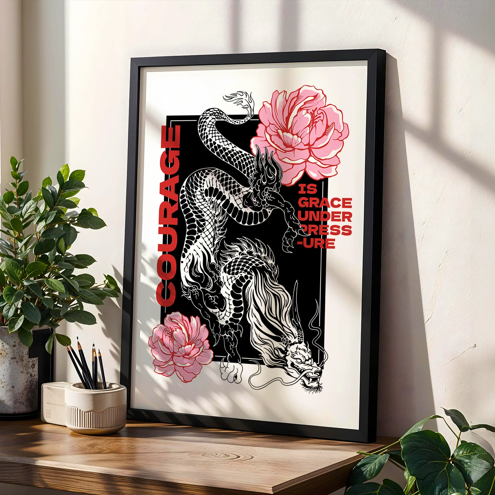This poster features a detailed Japanese dragon surrounded by large peony flowers and bold typography. The Japanese dragon poster combines traditional Asian imagery with a strong modern graphic style. The word “Courage” appears in large red letters, together with the phrase “Courage Is Grace Under Pressure.” The contrast between the dark background, white dragon, and pink flowers makes the design stand out clearly on the wall. Printed on high quality paper, the Japanese dragon poster fits perfectly in living rooms, studios, or modern interiors.