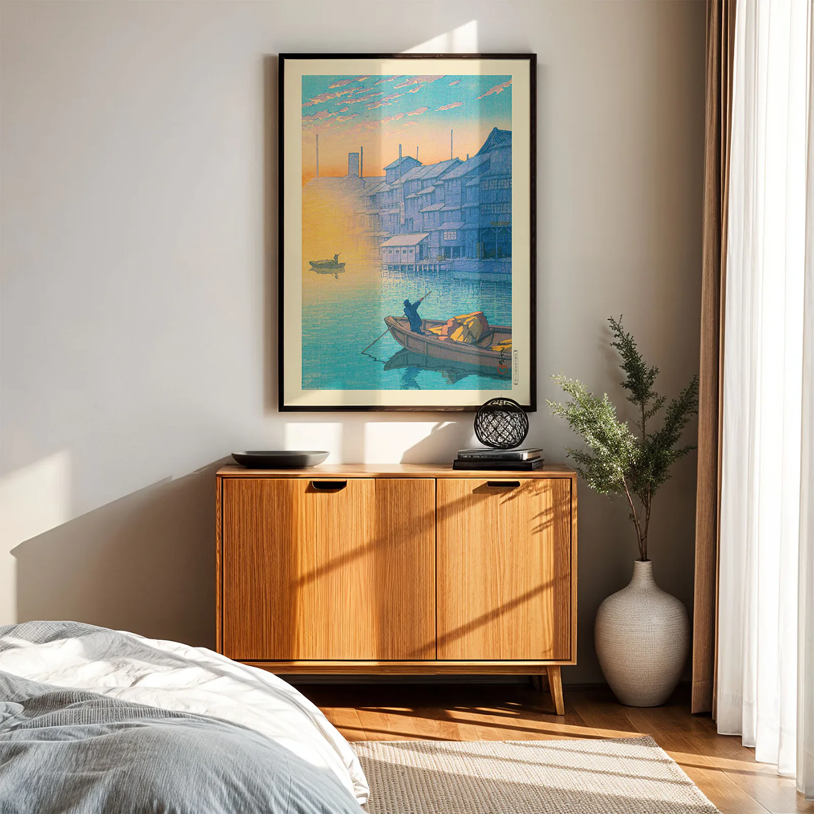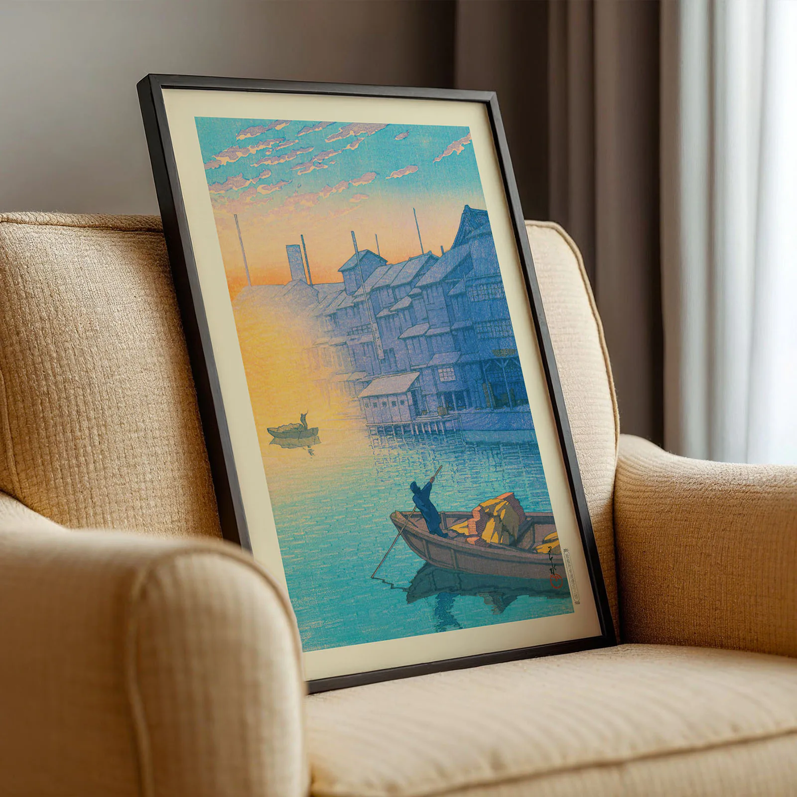 This Japanese retro poster, titled Morning at Dotonbori in Osaka, shows a calm city river view just after sunrise. A man rows a boat filled with goods while warm sunlight touches the water and nearby buildings. This high-quality reproduction is based on a traditional woodblock print by Kawase Hasui, celebrated for his peaceful and detailed landscapes. Printed on thick, premium paper, this Japanese retro poster adds color and tranquility to any room.
