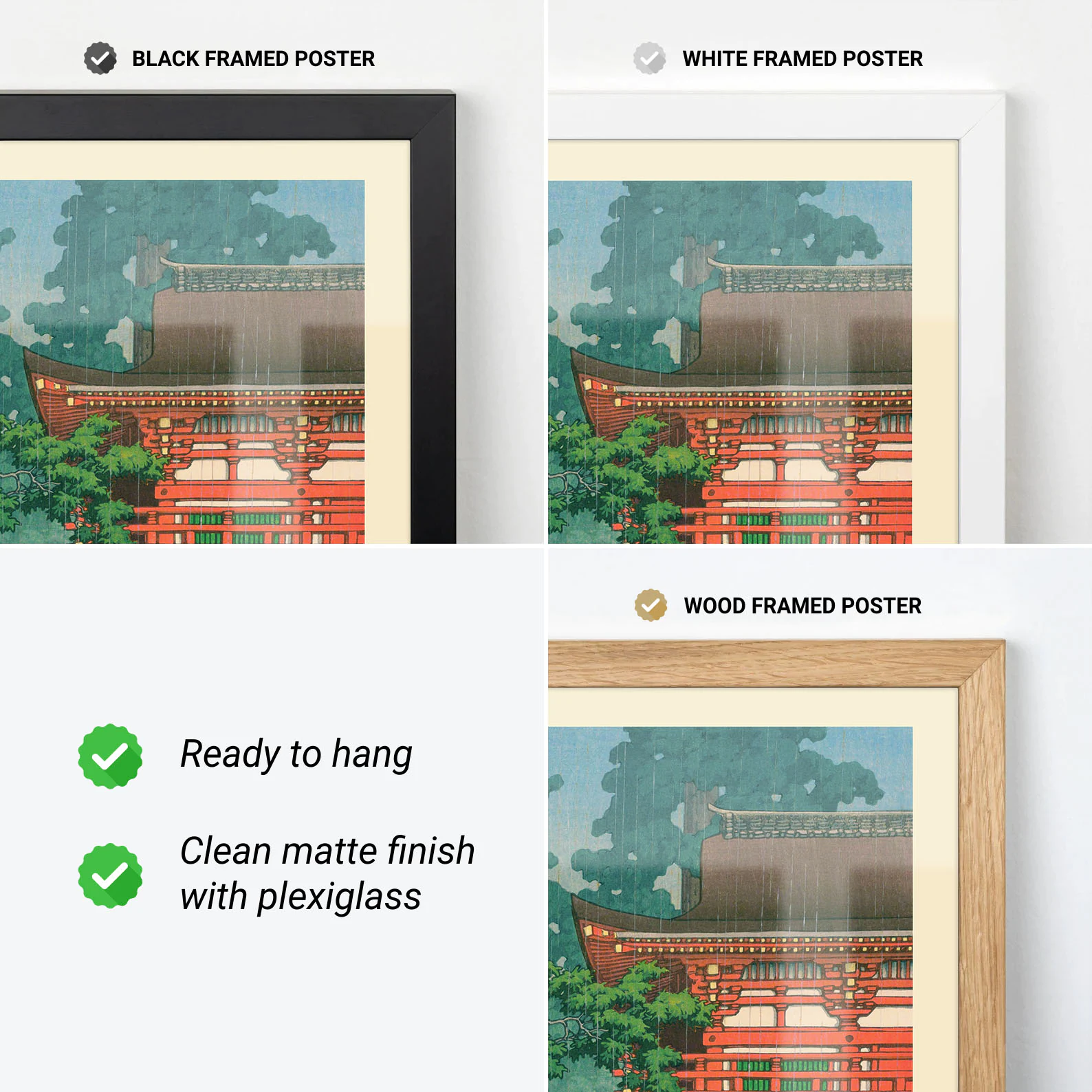 This Japanese wall art print, titled Rain at Kasuga Shrine, shows two women under a blue umbrella walking through a peaceful temple gate during gentle rain. The reflection of the shrine in the wet ground adds calm beauty to the scene. This is a high-quality reproduction of the original woodblock print by Kawase Hasui, a master of Japanese landscape art. Printed on thick, premium paper, this Japanese wall art brings quiet elegance and timeless charm to any interior.