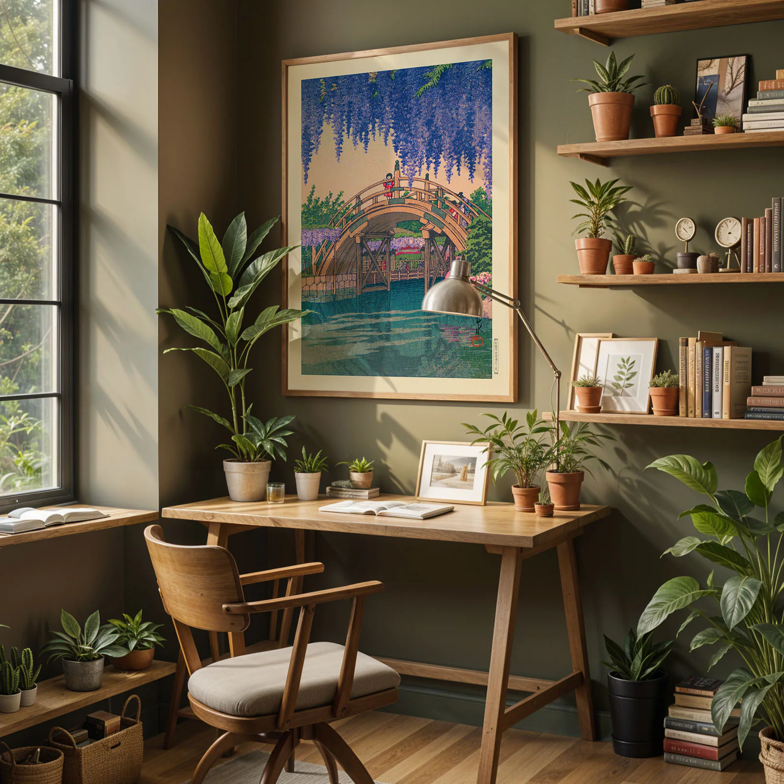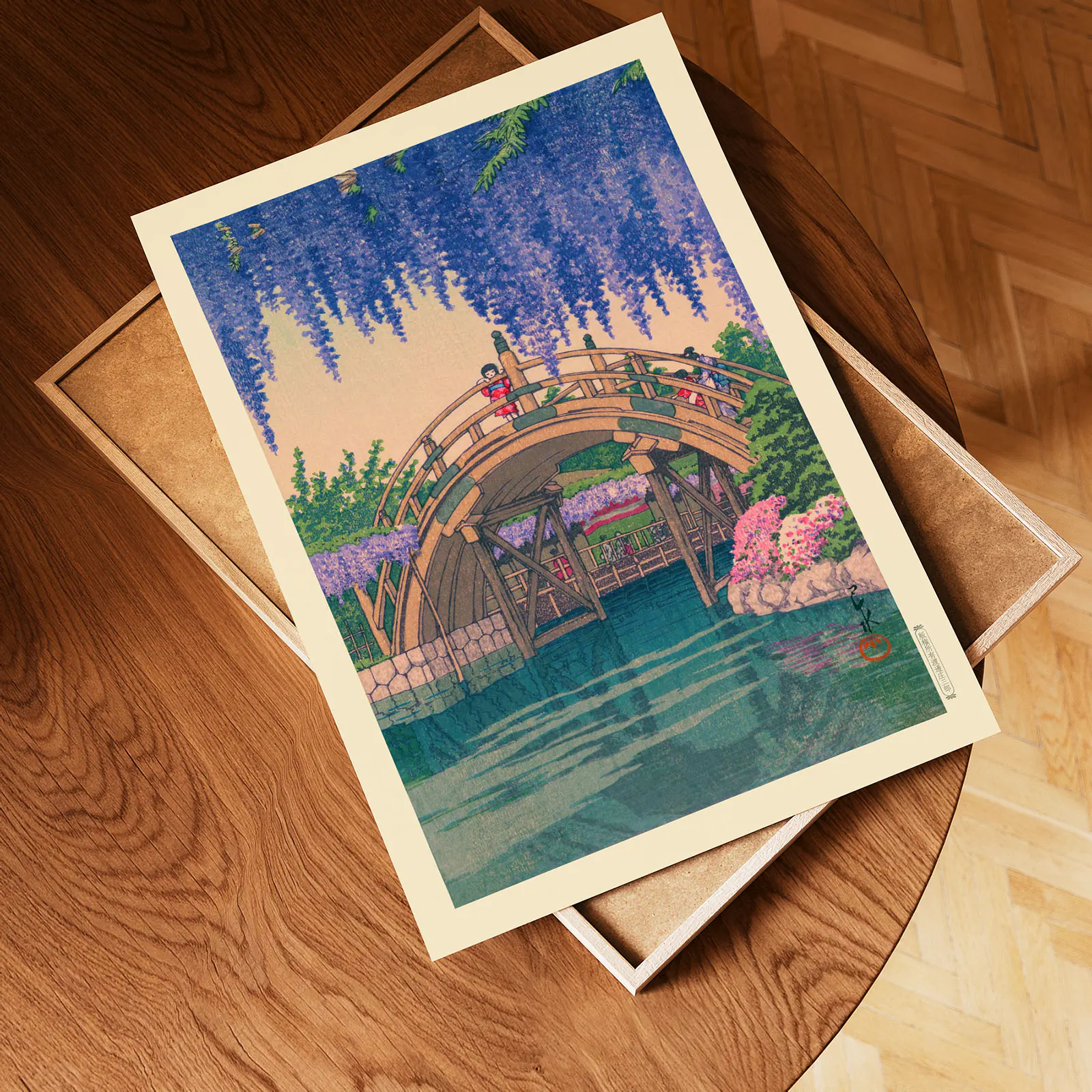 This Japanese woodblock print, titled Wisteria of Kameido, captures a peaceful garden scene with a curved wooden bridge and cascading wisteria flowers. People walk quietly across the bridge, surrounded by blooming trees and soft water reflections. This is a high-quality reproduction of the original woodblock artwork by Kawase Hasui, known for his poetic views of Japan. Printed on thick, premium paper, this Japanese woodblock print brings color, calm, and timeless beauty into any space.