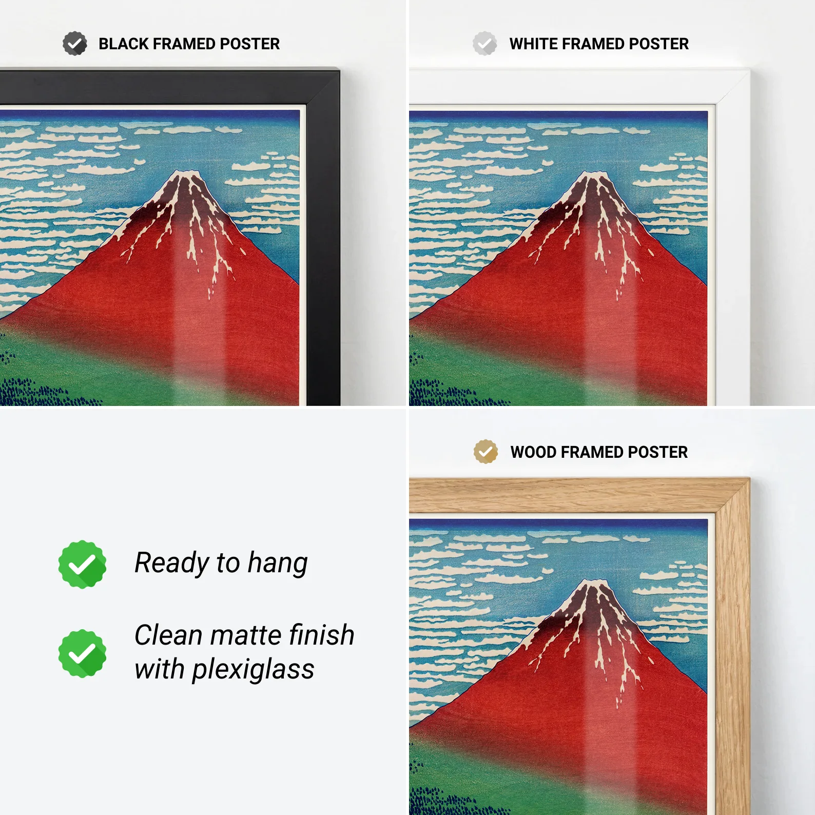 You can order our posters and canvas prints with or without a frame. The frames are made from wood and are 2 cm wide. Poster frames include a clear acrylic glass and all parts needed for hanging.