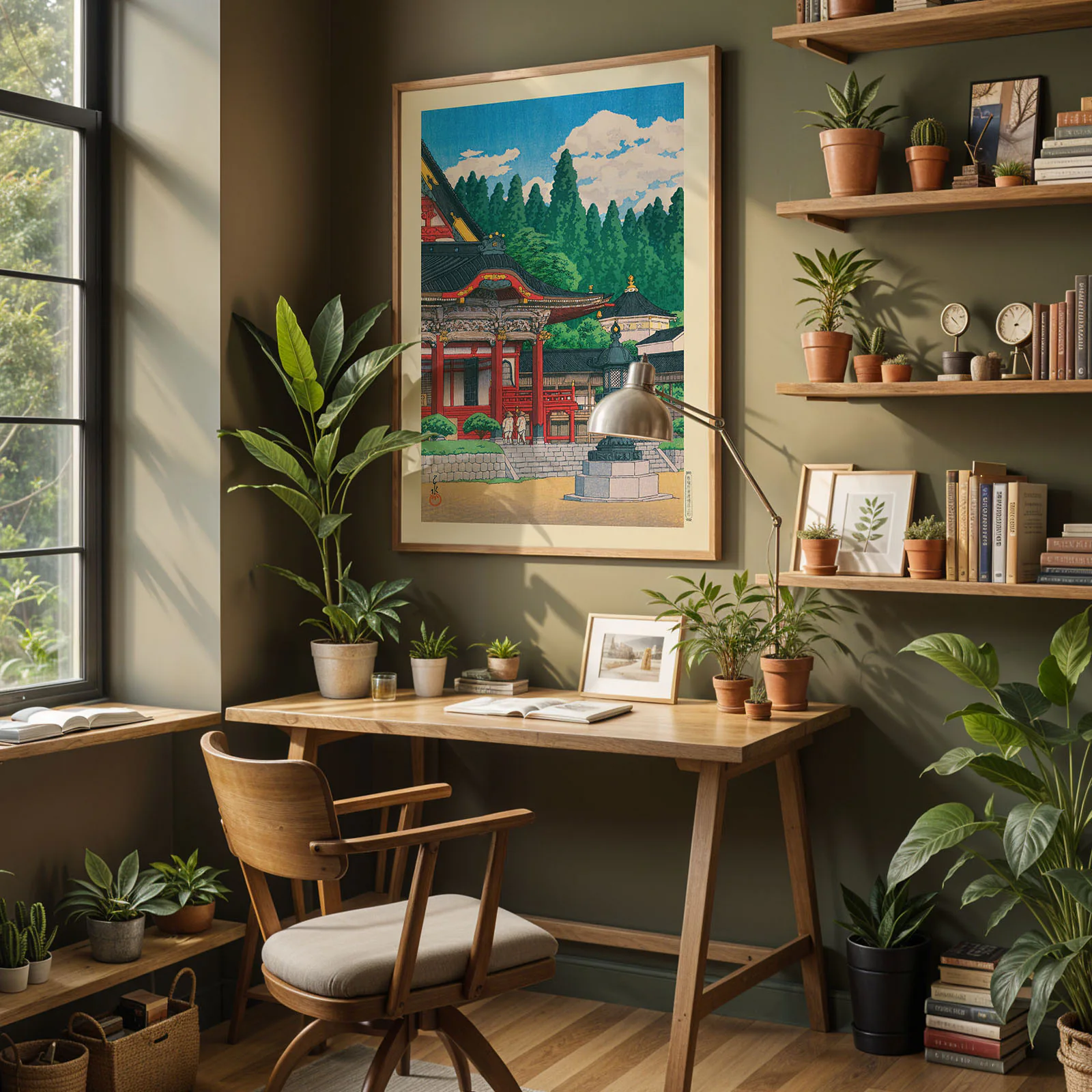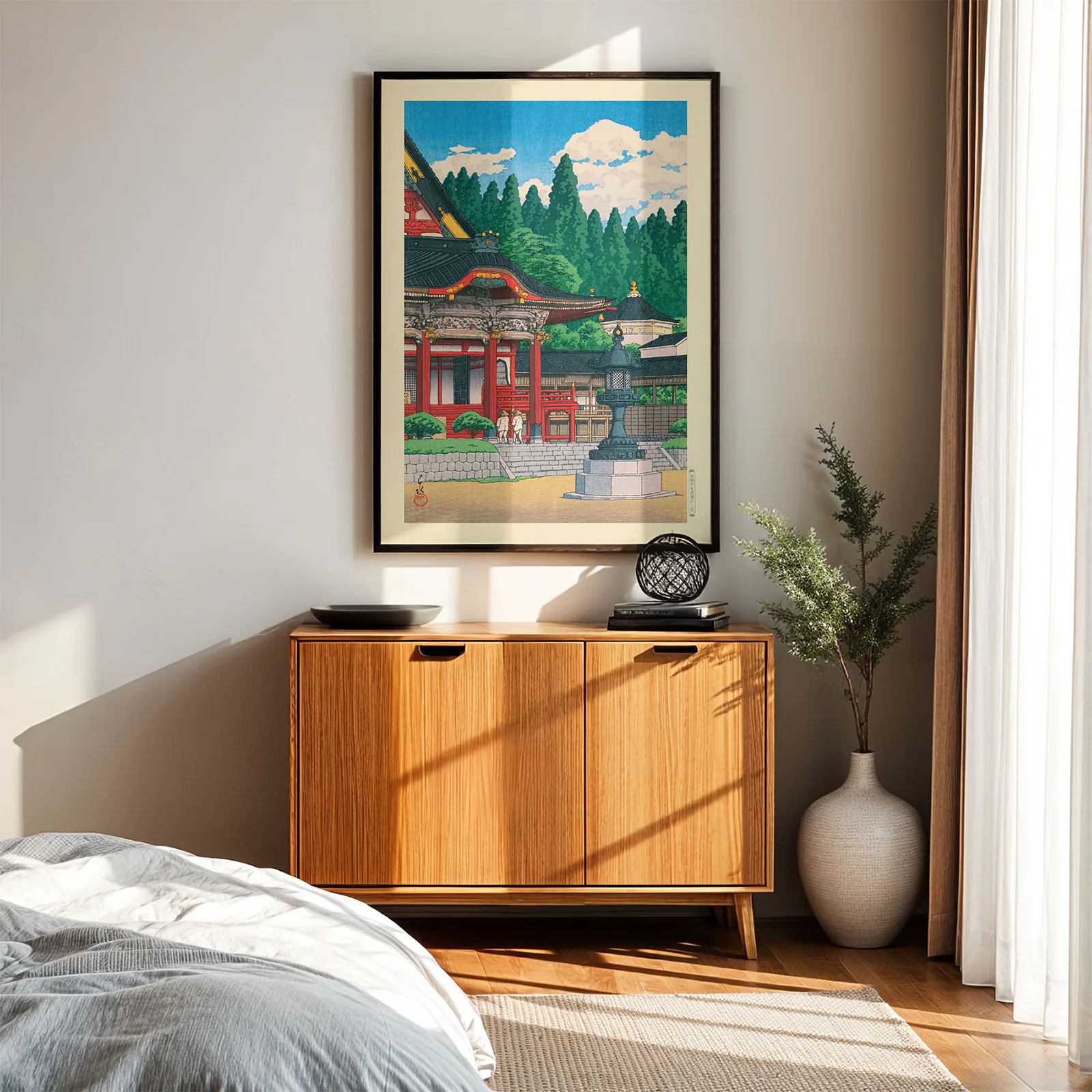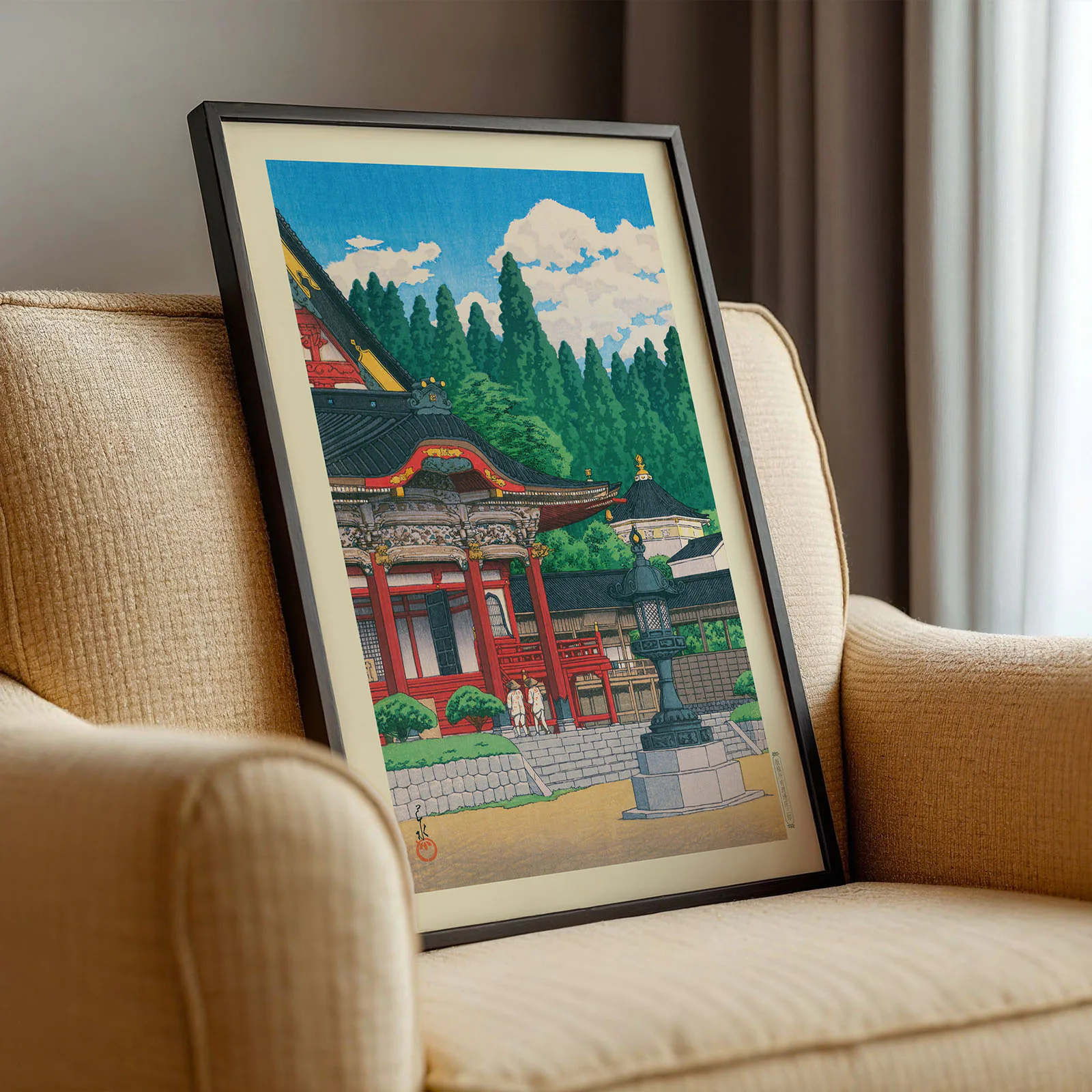 This Kawase Hasui art print shows the beautiful Kuon Temple at Mount Minobu, framed by tall pine trees and a bright blue sky. The deep red temple building stands out with its fine details, while two figures walk quietly along the steps. This is a high-quality reproduction of Hasui Kawase’s original Japanese woodblock print, known for his calm and elegant views of Japan. Printed on thick, premium paper, this Kawase Hasui art print brings timeless beauty and balance to any space.