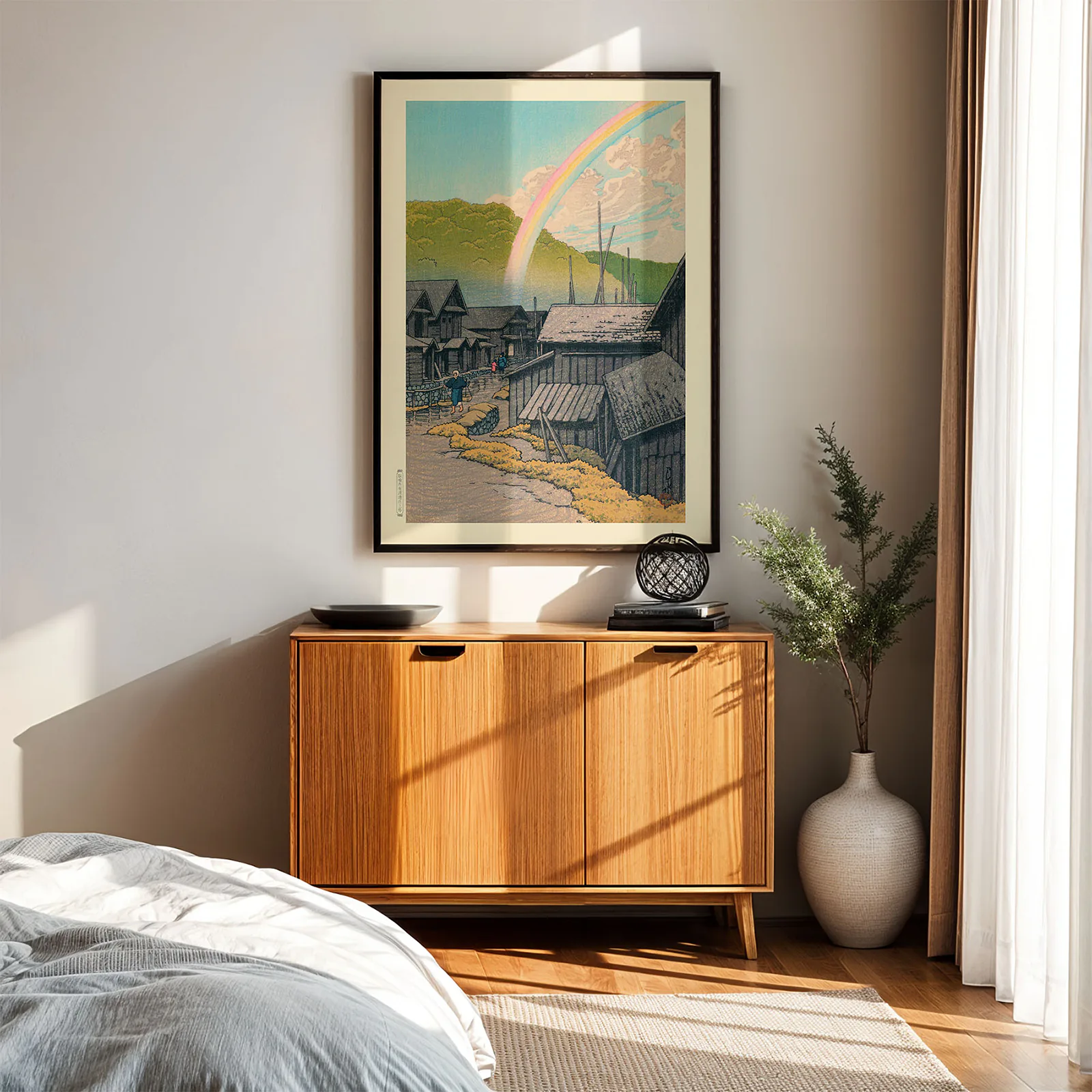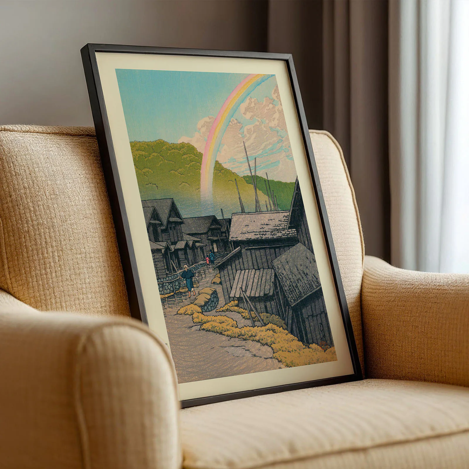 This Kawase Hasui artwork print shows a quiet village with wooden houses, soft hills, and a rainbow stretching across the sky. The scene comes from an original Japanese woodblock print by Hasui, known for his peaceful and detailed landscapes. The soft colors and warm light bring a calm, nostalgic feeling to any space. This reproduction is printed on thick, high-quality paper to keep the artwork looking beautiful for years. A perfect choice for adding quiet beauty and harmony to your wall, this Kawase Hasui artwork print will never go out of style.