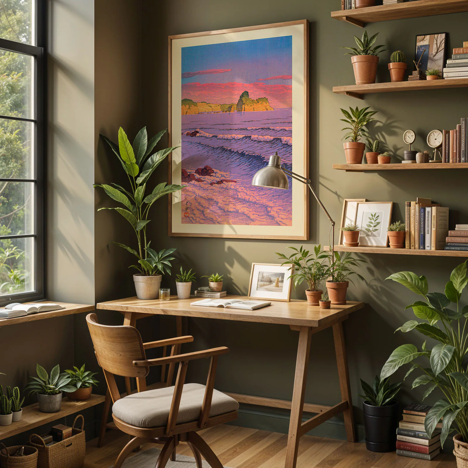 This Kawase Hasui print, titled Morning Sea at Shiribeshi, captures a vivid sunrise over soft ocean waves and golden coastal cliffs. The sky glows in warm pink and purple tones, while gentle waves roll toward the shore. Hasui’s masterful use of color and light creates a peaceful seaside mood. Printed on thick, high-quality paper, this Kawase Hasui artwork adds a bright and calming touch to any space – perfect for coastal interiors or quiet corners.
