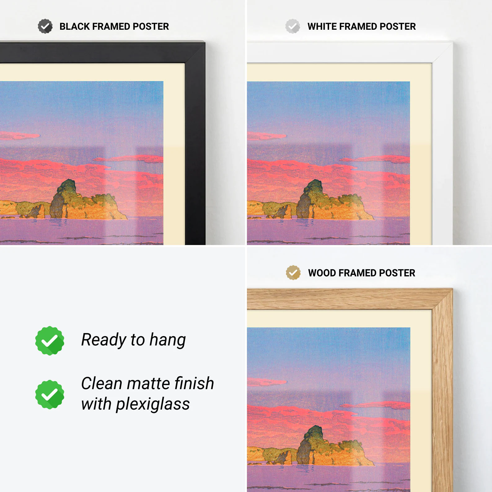 You can order our prints either framed or unframed. Our frames are crafted from lightweight pine wood, measuring 2 cm in width. Each frame includes an acrylic front protector and hanging hardware for easy setup.