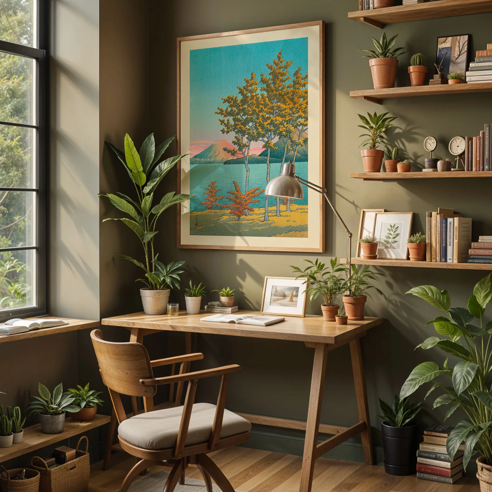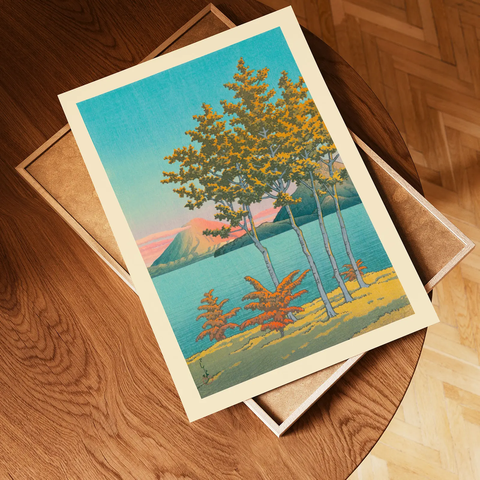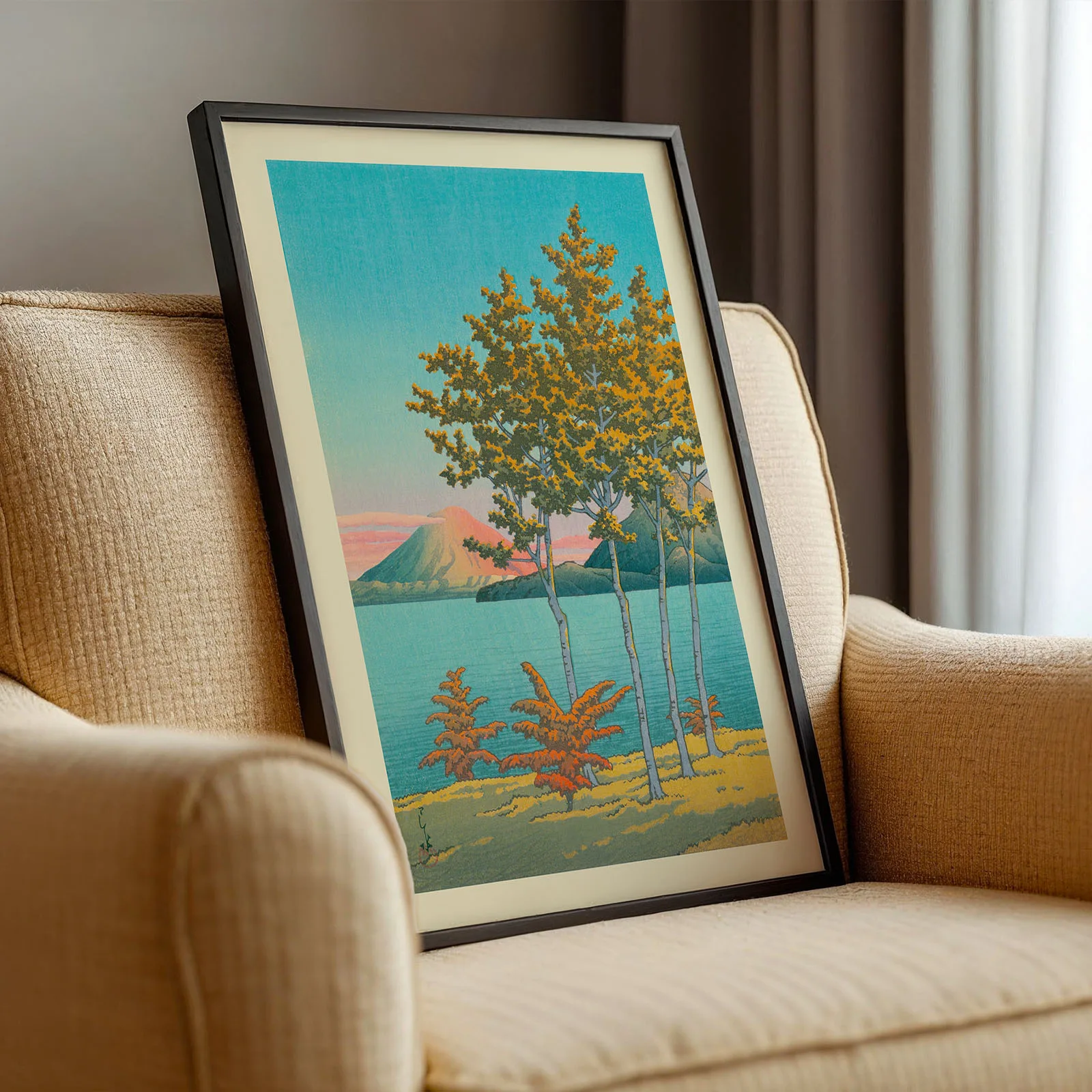 This Kawase Hasui poster shows a peaceful lake scene with tall trees, gentle hills, and a soft pink sky. The calm colors and detailed lines create a quiet and relaxing mood. It’s a perfect choice for bedrooms, reading corners, or any space that needs a peaceful feeling. This poster is a high-quality reproduction of an original Japanese woodblock print by Kawase Hasui, known for his tranquil and timeless landscapes. Printed on thick, high-quality paper, this Kawase Hasui poster will stay beautiful for many years.