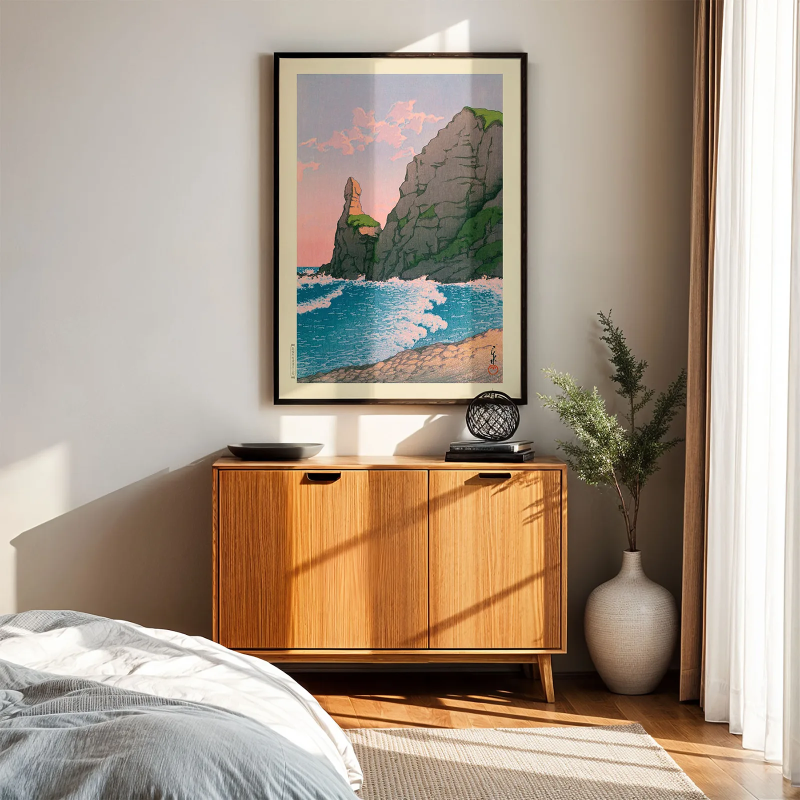 This Kawase Hasui woodblock print, titled Setakamu Rocks in Shiribe, shows a peaceful seaside view with large cliffs, soft waves, and a warm pink sunset sky. The scene feels calm and natural, perfect for creating a relaxing mood at home. This print is a high-quality reproduction of Hasui Kawase’s original Japanese woodblock artwork, known for its timeless beauty and detailed landscapes. It’s great for bedrooms, reading areas, or peaceful corners. Printed on strong, high-quality paper, this Kawase Hasui woodblock print will stay beautiful for many years.